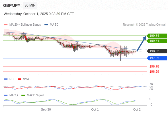 英镑/日元 当日内: 看涨。