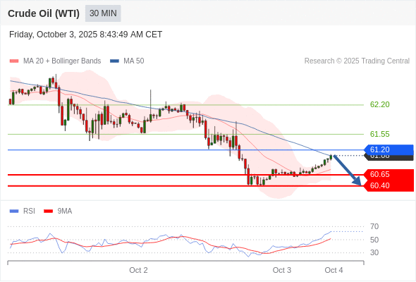 交易策略: 在 61.20 之下,看跌,目标价位为 60.65 ,然后为 60.40 。
