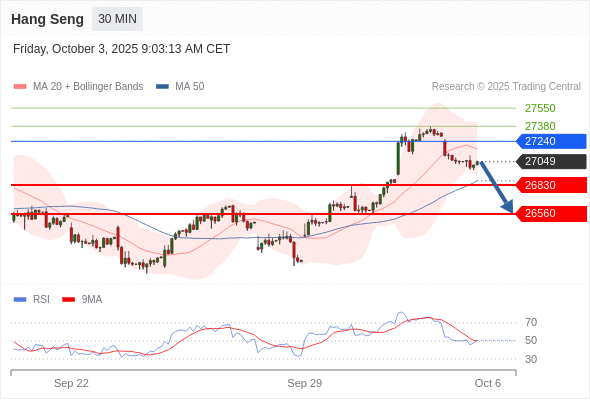 恒生指数 当日内: 目标位为26560。