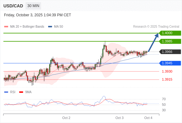 在 1.3945 之上,看涨,目标价位为 1.3985 ,然后为 1.4000 。