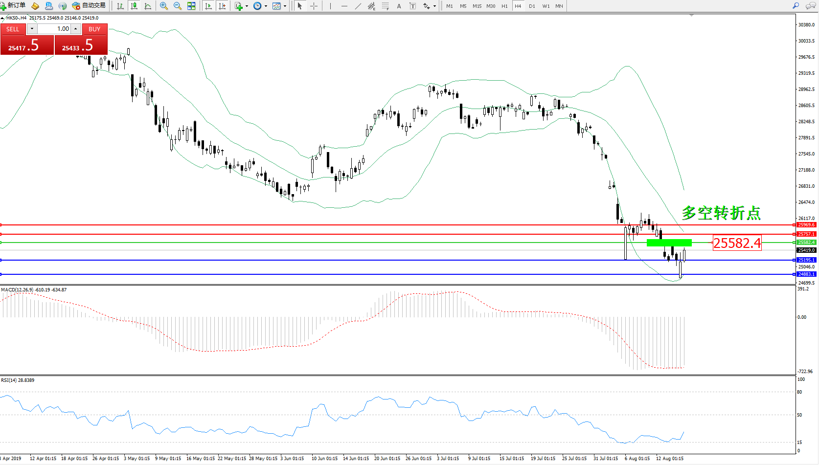 香港恒生指数8月15日(周四)收盘上涨193.18点,涨幅0.76%,报25495.46点;恒指夜期昨晚受累美股重挫而跌穿25000关口,低见24791。早上同跟随外围大幅低开,再小幅向下,最多跌402点,恒指低见24899。欧洲经济数据疲软,美债收益率曲线出现严重倒挂,市场对全球经济放缓的担忧持续蔓延,如今各个风险因素令投行及投资者信心动摇,目前投资者将保持观望。