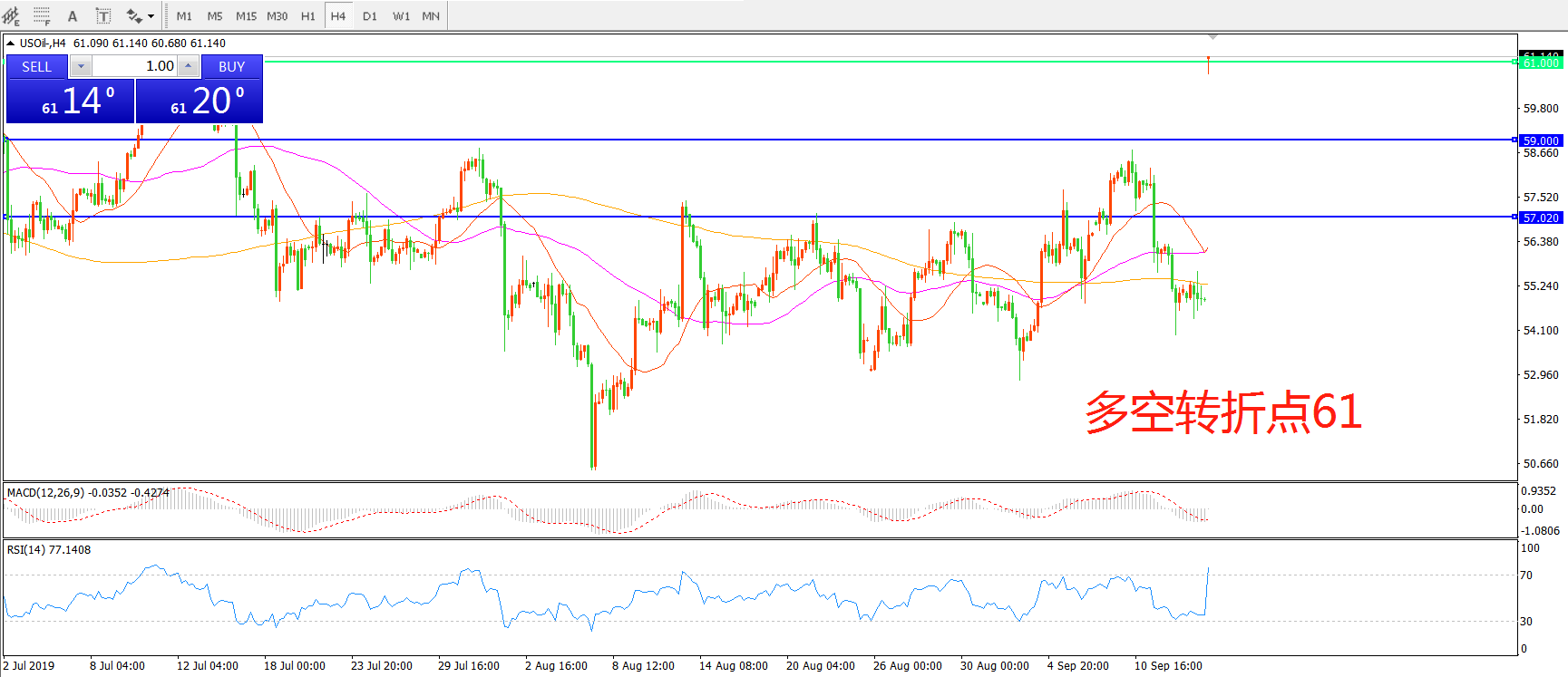 4小时图看,油价受沙特断供消息刺激跳空高开,目前位于61美金附近进行争夺,重点关注这一区域的得失,不排除日内有回补缺口的可能,但如果油价在这个位站稳,可能开启会新一轮的上涨趋势。