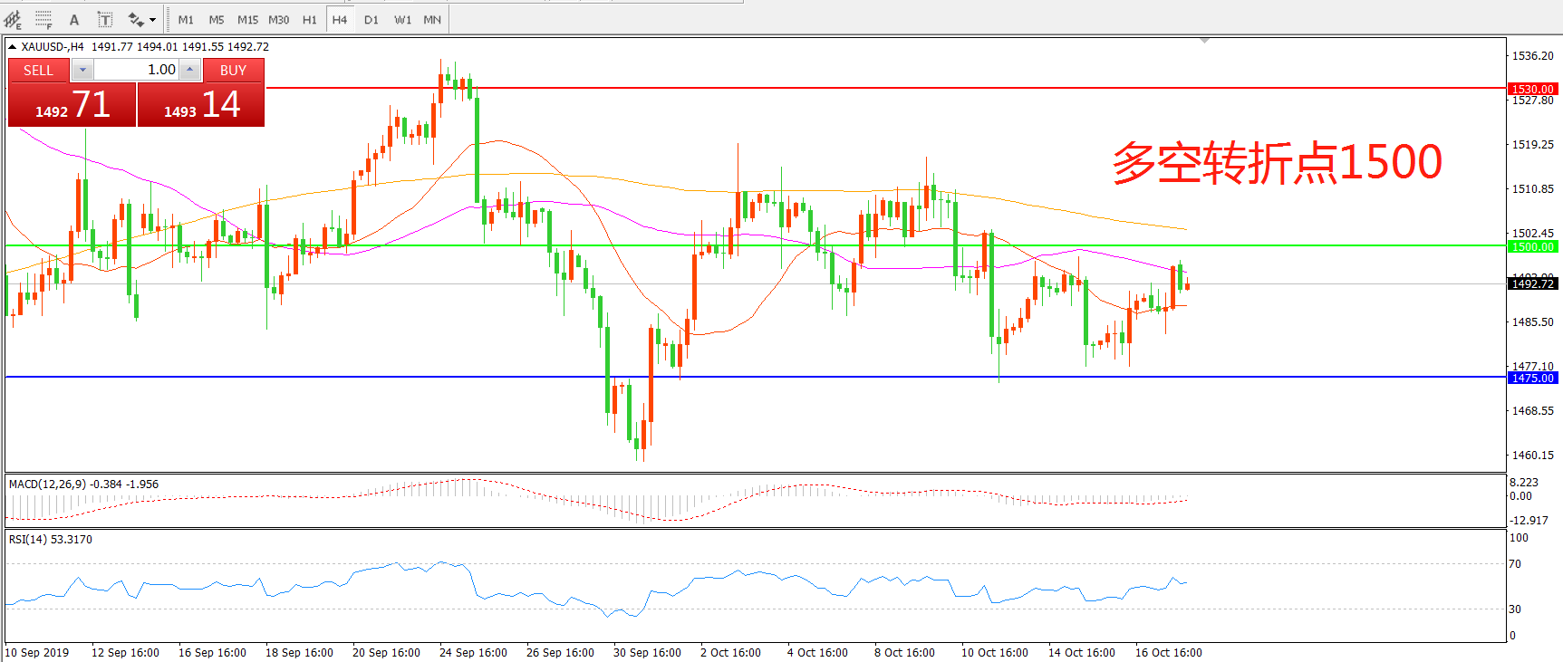 周四(10月17日),晚间,欧盟委员会主席容克与英国首相约翰逊同时宣称,英国与欧盟达成脱欧协议,市场风险情绪一度回暖,金价承压,然而,这份协议仍然遭到了工党领袖和北爱尔兰民族统一党的反对,周末英国议会能不能通过这份协议还是未知数,金价探底回升。最终收报1493.68美元/盎司。