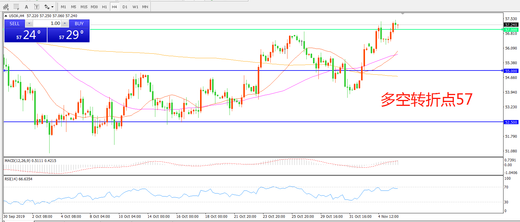 4小时图看,油价突破57美金阻力后站稳,短线走势偏强,均线系统拐头向上,MACD红柱增加,RSI指标走平,日内油价延续上行概率较大。