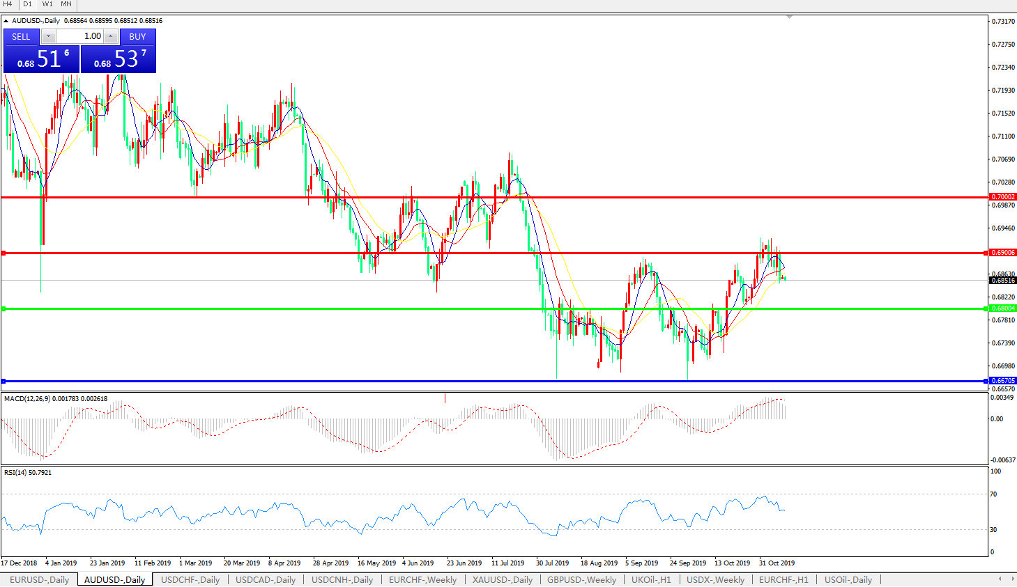 澳元兑美元在周五日内震荡走低,短暂上破0.69关口后便快速回落,触及日低0.6876,此后持续低位徘徊。虽然汇价整体跌幅不大,但在汇市总体波动受限的大环境下,其跌幅已经在G10货币中领先; 此前,澳元兑美元曾于周四升至0.6913高位,原因是继续受到了贸易利多前景的推动,但之后,在相关消息引发的狂欢开始退潮后,风险资产价格随之回落。虽然,周五日内市场乐观情绪再起,但投资者却把更多目光转向了央行政策,这使得澳元在短暂走强后再度承压;市场从澳洲联储发布的会议纪要解读出其未来仍不排除继续降息的可能性,而之前率先降息的澳洲联储正是本轮全球央行宽松周期的开路先锋,这直接进一步打压了澳元的汇价,令其在整体市场情绪依旧显著乐观的背景下意外领跌。而考虑到当前已是周末前的最后交易日,往常投资者会在此时重新倾向买入避险资产规避周末的突发事件,因此大环境对澳元更加不利。尤其,是在中国10月份CPI数据将在周六出炉这一背景下。