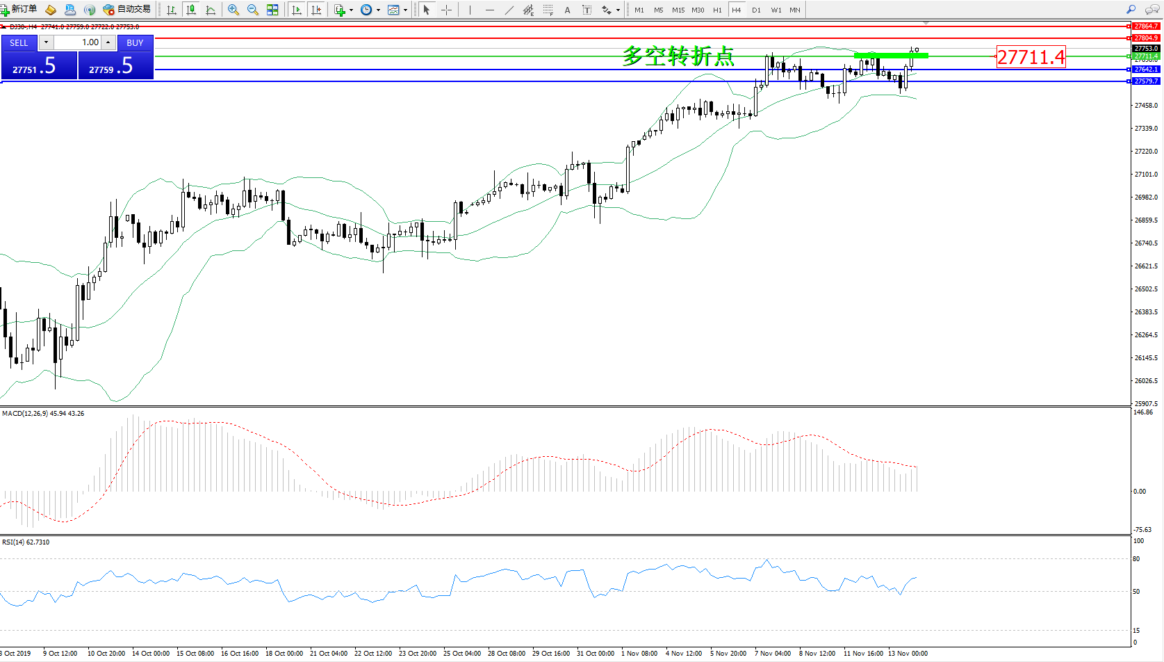 道琼斯指数11月13日(周三)收盘上涨92.10点,涨幅0.33%,报27783.59点。美国CPI数据整体好坏参半,全球贸易局势利好。美债收益率普遍下跌;30年期美债收益率跌超7个基点,现报2.343%。美联储主席鲍威尔:与过去相比,美联储没有降息空间,就业市场没有释放过热的信号,美国经济能很好的应对更低的失业率。