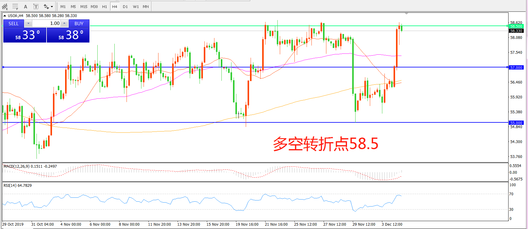 4小时图看,油价长阳拉升,触碰58.5附近阻力小幅回落,整体走势偏强,均线系统走平,MACD绿柱缩短,红柱增加,RSI指标向上,58.5一线将成为短期多空分水岭。