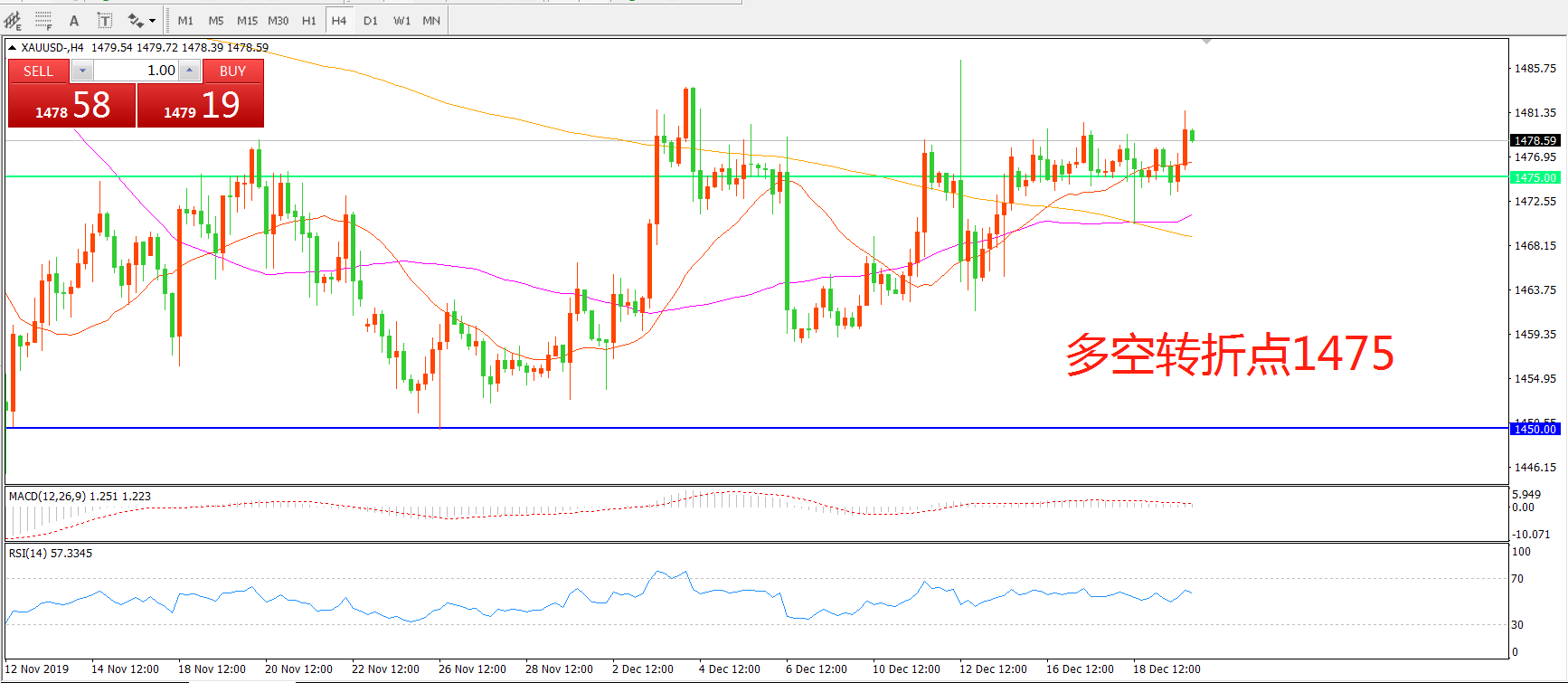 周四(12月19日),美众议院正式通过对特朗普的弹劾案,但其市场影响力似乎不大,贸易局势的不确定性以及邻近圣诞节假期,市场交投十分谨慎,因此波动相对有限。现货黄金整体维持震荡走势,收报1478.89美元/盎司。中美谈判虽然签署了第一阶段协议,但并无后续内容传出,两大国的贸易谈判始终牵动着投资者的心,对此方面的消息,要密切关注,根据中国商务部的消息,双方经贸团队正在就协议签署等后续工作密切沟通。