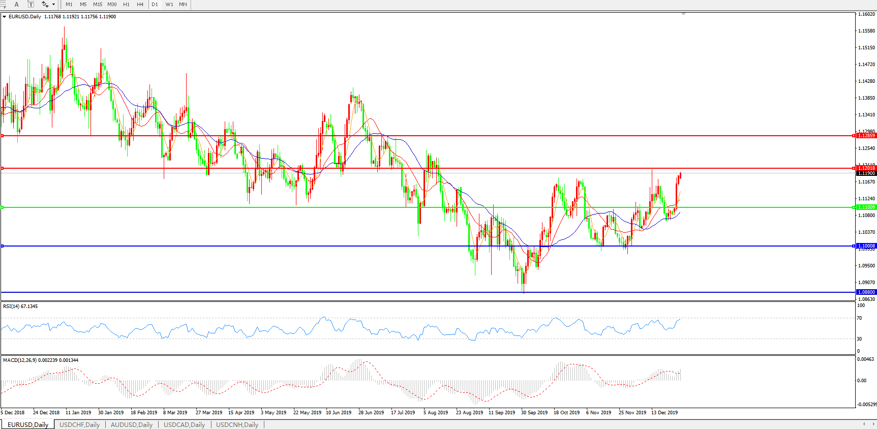 欧元兑美元在周五日内大幅走强,欧洲时段盘中触及一周多新高1.1150,原因在于在圣诞假期过后,市场资金进行的重新配置,此前在节日期间流入美元计价资产避险的资金重新在乐观市场情绪的推动下重新流向高风险货币,导致欧系与商品系货币普涨;此外,欧洲央行日内发布新报告,对2020年经济前景给出积极预测,认为欧元区经济最低迷的时刻已经过去,这也进一步强化了市场做多欧元的动能。投资者同时还继续看好全球多边贸易环境能够在2020年得到进一步的缓和重整; 这意味着欧元兑美元有望自71日以来,时隔近半年日线收盘再度站上200日均线,而这将意味着中期走势有望录得反转,之后汇价将有望进一步上攻至1.1175一线