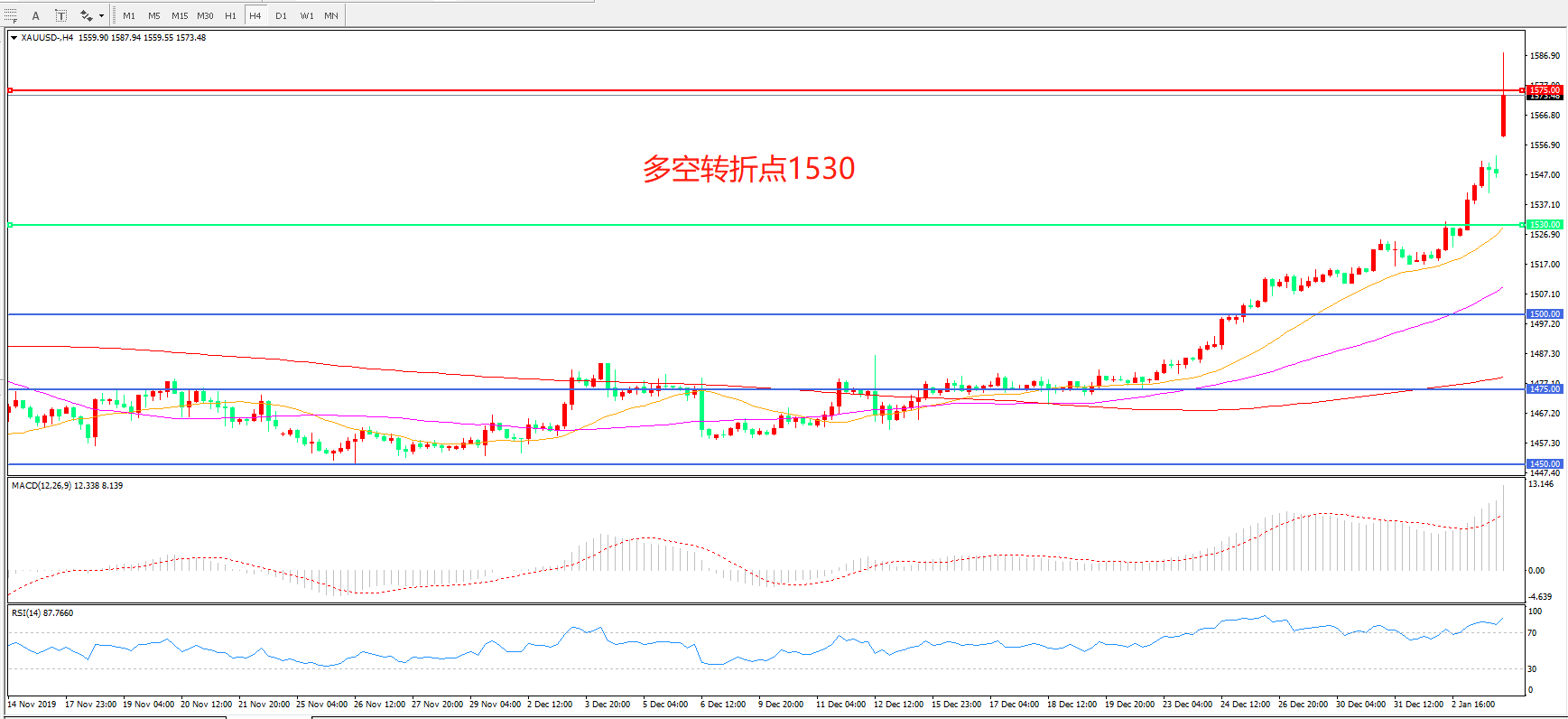 2020年1月3日,在伊朗有“名将之花”称号的苏莱曼尼将军在美军的一场空袭中身亡,随后,五角大楼发表声明,特朗普2日上午批准此次行动,下令在巴格达发动袭击。中东地缘政治紧张升级,避险情绪快速升级,金价跃升至近四个月来的最高点,最终收报1547.46美元/盎司。