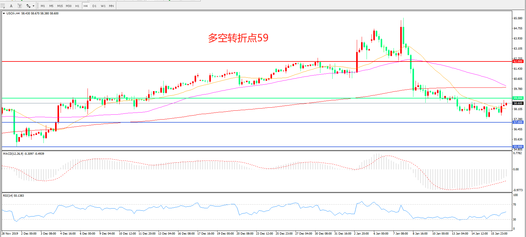 交易策略: 在59.00之下看跌,目标57.00       55.00