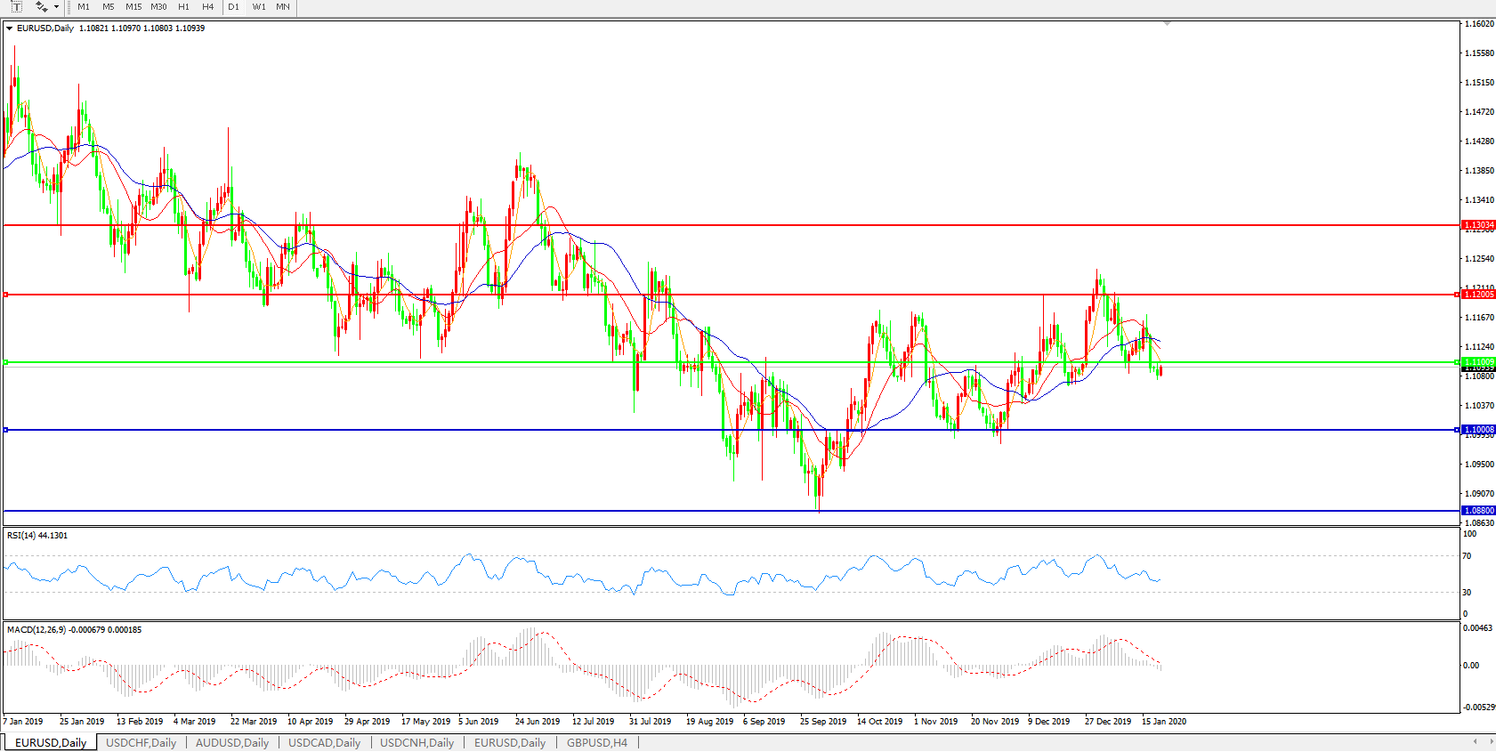 技术面简析:日图均线开始呈有序空头排列汇价延续弱势下破1.11关口MACD持续下行且量能0轴下方继续放量 RSI缓步走低,预计短期汇价大概率将进一步走低