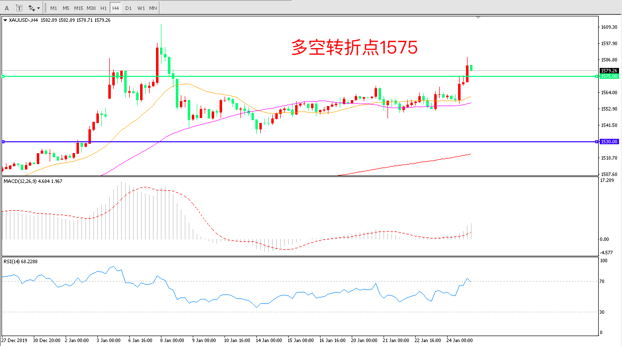 4小时图看,金价跳空高开,强势突破1575阻力,短期走势偏强,均线系统有拐头迹象, MACD红柱增加,RSI指标向上,短期金价维持上行概率较大。