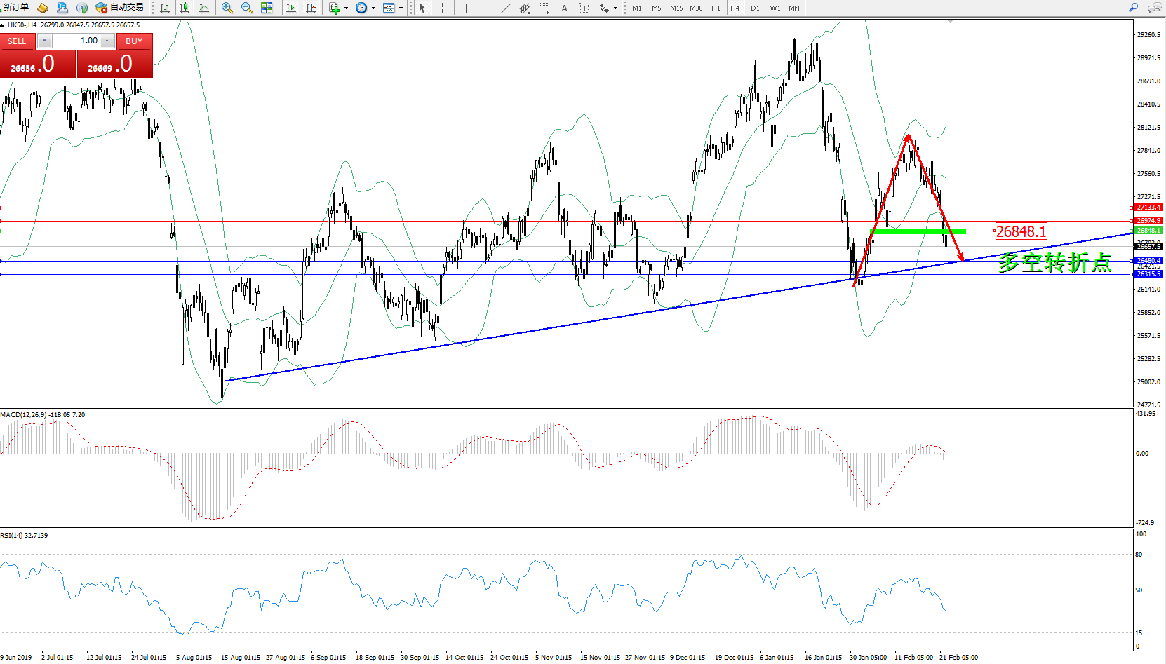 技术点评:高位空头动力持续下挫,延续布林带指标下轨不断下移中,且布林带指标呈张口走势中,低位上升趋势线相当明显,MACD指标刚跌破0轴线进入空头区域向下移动中,RSI指标处于多头区域缓慢整理跌破50均衡线进入空头区域持续向下移动;