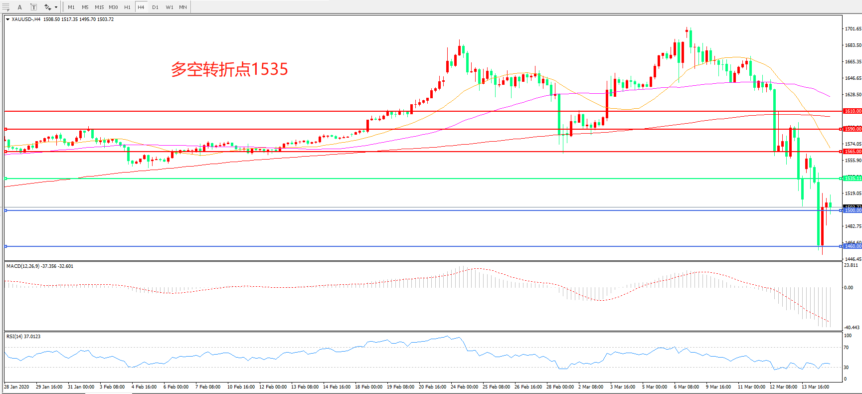 交易策略:在1535.00之下看跌,目标1500.00 1460.00