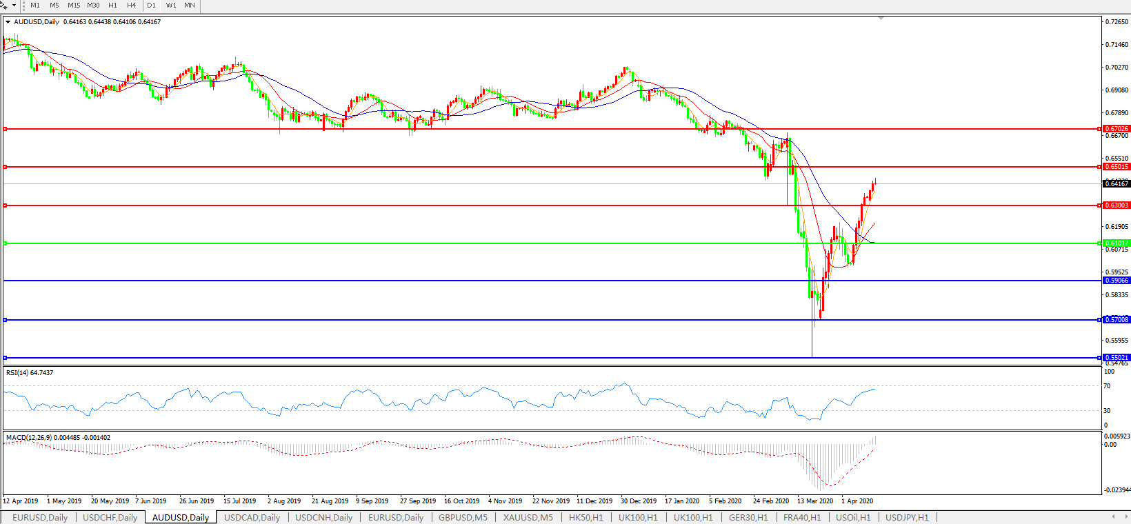 技术面简析:日图均线逐步呈有序多头排列,汇价延续上涨态势再度小幅冲高,MACD于0轴下方延续上行态势且量能0轴上方维持放量,RSI持续缓步攀升,预计汇价大概率将进一步上行,关注上方0.65关口的压制。