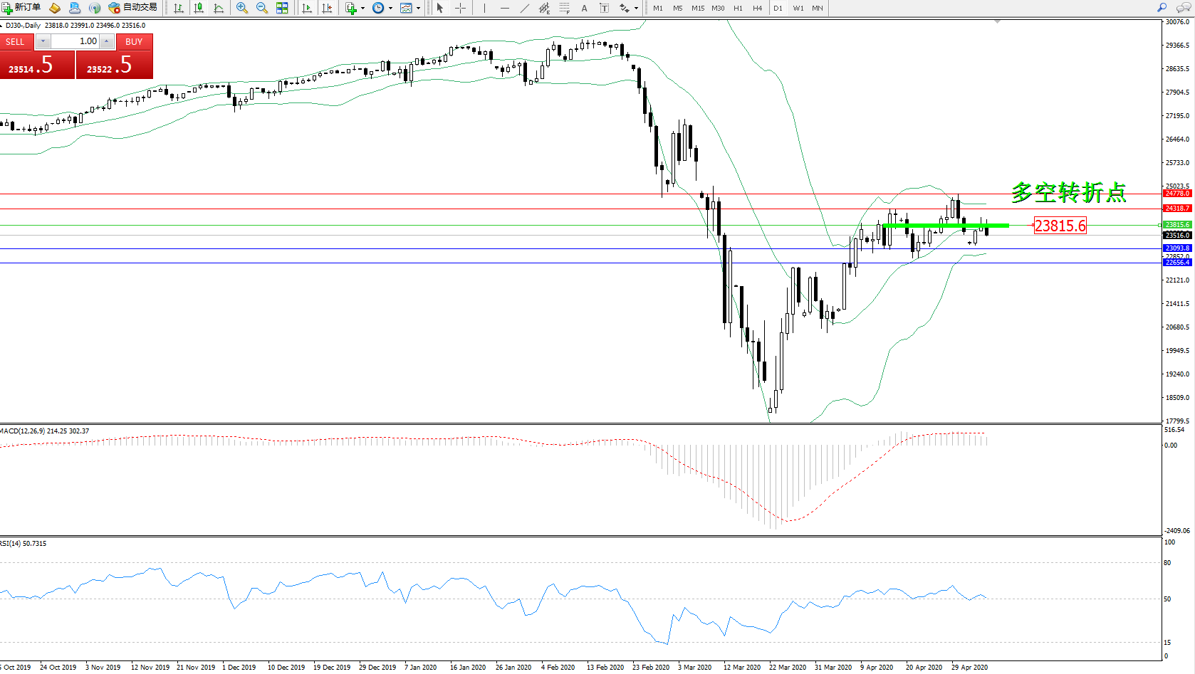 道琼斯指数周三收盘下跌218.50点,跌幅0.91%,报23664.64点。美国经济前景疲软,ADP数据显示美国公司4月就业人数出现2002年有纪录以来最大降幅;周五公布的非农就业报告料将显示,4月失业率从3月的4.4%上升至16%。美国应该逐渐恢复经济活动,从而避免经济遭受更深的伤害。有关经济部分重启的言论支持了对高风险资产的需求,美联储布拉德:认为疫情主要经济影响在二季度体现,4月就业数据将跌至历史新低,预计三季度是过渡期,四季度经济将相对快速复苏,失业率可能触及20%甚至更高,美联储政策利率非常低,预计将保持在低位,美联储可能会在下半年就前瞻性指引发表更多意见。