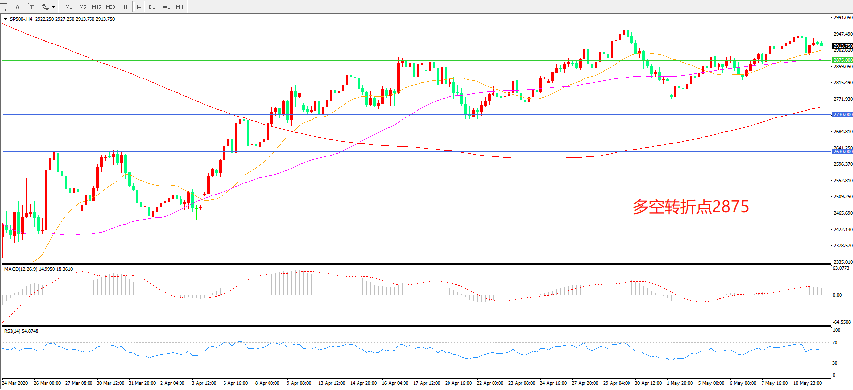 4小时图看,标普500维持高位震荡,整体波幅不大,2875一线被突破,短期走势偏强,均线系统走平,成为下方支撑,MACD红柱增加,RSI指标走平,日内延续震荡概率较大。