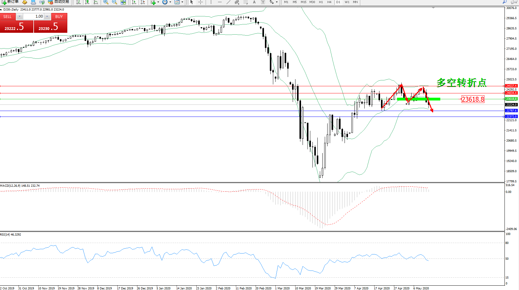 道琼斯指数5月13日(周三)收盘下跌516.80点,跌幅2.17%,报23247.97点。美股大幅收跌,尽管股指在交易结束前的最后几分钟缩减跌幅,收在日低上方,但投资人看似消化了比之前预期更严重的经济萎缩,担心鲍威尔发出的增加财政刺激的呼吁不会得到回应。鲍威尔暗示美联储不会将利率降至零以下,美联储主席鲍威尔表示当前没有考虑负利率政策,尽管他对经济增长持悲观看法;鲍威尔表示,美国经济面临前所未有的下行风险,如有必要,将采取更多刺激措施,以缓解新冠肺炎疫情对经济的冲击。