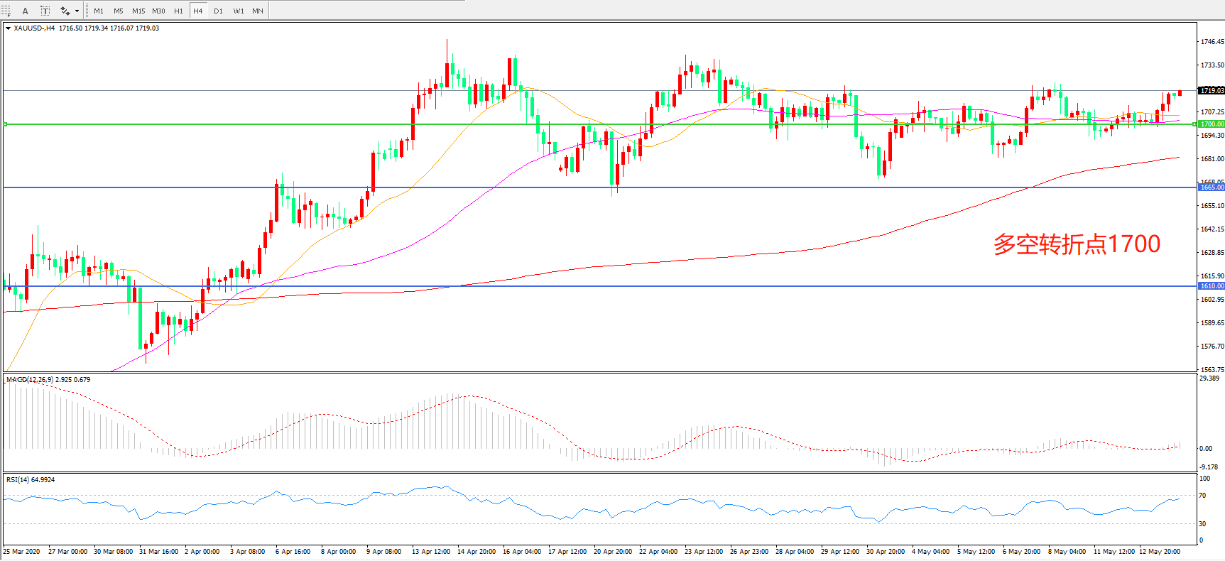 周三(5月13日),美联储主席鲍威尔强势表态不会动用“负利率”工具并警告这次经济衰退比第二次世界大战以来的任何衰退都要严重得多,市场恐慌情绪继续走高,金价宽幅震荡后维持强势,收报1716.76美元/盎司。