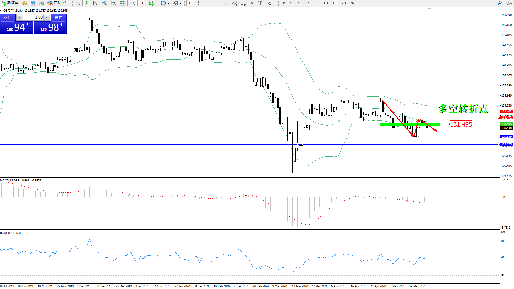 英镑兑日元下跌至130.948附近;随着英国负利率的议论导致日本散户抛售英镑,英镑兑日圆将进一步上跌。有关英国负利率的猜测可能引发日本散户市场的卖盘,这里的市场参与者建立了大量的多头仓位,日本以外的收益率下降是日元的关键支撑因素,如果英国负利率猜测持续,将增加下行压力。英国4月份预算赤字升至创纪录水平;中央政府支出激增57%,收入下降27%;英国国家统计局周五表示,上月预算赤字为621亿英镑(760亿美元);这个数字相当于上一财政年度全年借款总额;4月份赤字为1993年有现代记录以来最高水平。