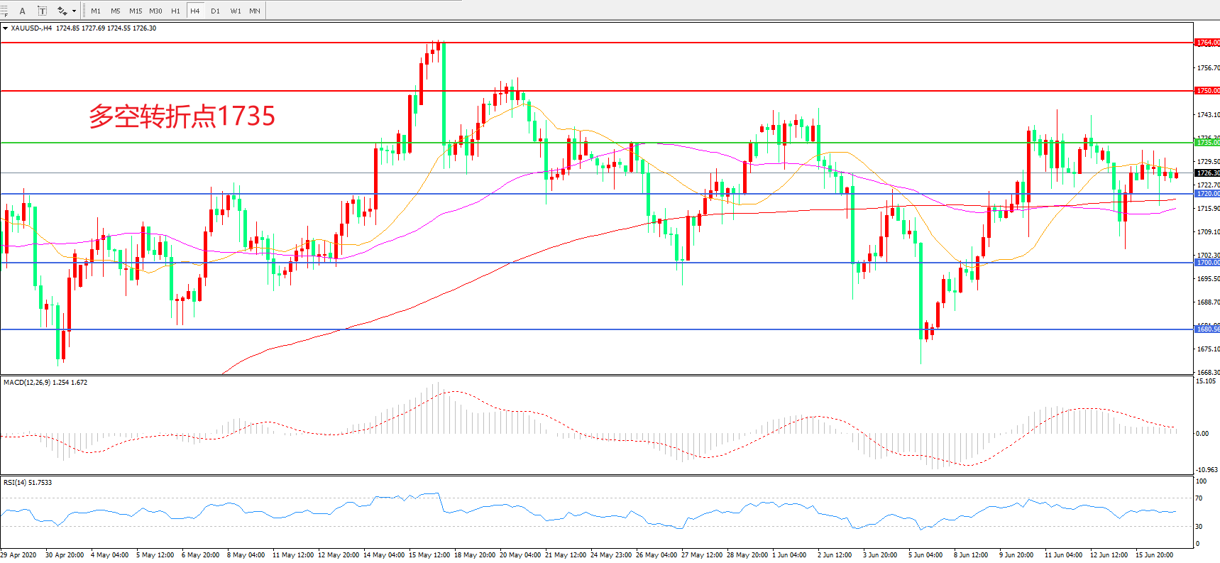 周二(6月16日),特朗普万亿基建方案市场风险情绪带来提振,但美联储主席鲍威尔称,美国经济复苏的时间和强度存在很大不确定性,重申利率将维持在零附近,金价在多空交织中延续震荡,收报1726.72美元/盎司。
