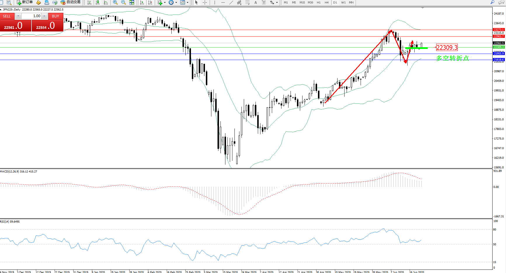 日经225指数622日(周一)收盘下跌52.29点,跌幅0.23%,报22426.50点。花旗预测把贸易问题和复苏状态考虑在内,MSCI亚洲(除日本)指数也将在未来12个月里上涨5%,略好于世界其他地区的指数。尽管如此,花旗还是“相当谨慎”,而盈利预测也“过于乐观”,预计2020年每股收益萎缩40%,然后在2021年反弹40%,亚洲(除日本)目前基于花旗2021年预期每股收益的市盈率为19倍,共识预测为13倍。除日本以外的亚洲股票配置:超配中国和新加坡,低配印度和东盟。目前市场面临的如果疫情二次蔓延风险回升,对于疫情敏感的股市将很容易开启新一波下跌行情。目前市场的预期是疫苗面世最快的时间是2021年上半年,即使是最为乐观的观点也认为可能要到2020年末。问题是疫情二次蔓延的风险.