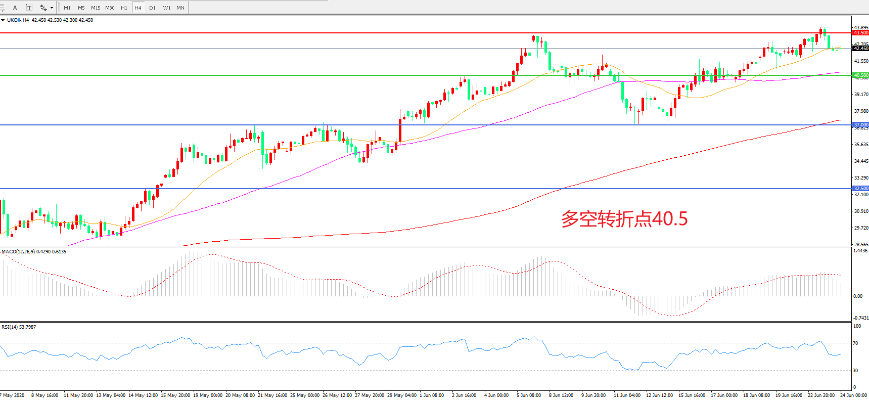 周二(6月23日),原油价格上演了一幕冲高回落的大戏,在亚欧盘时段,市场轻而易举的突破了前期高点,显示了多头无与伦比的自信,但进入美盘阶段,风险情绪回落,美股伴随着原油价格一同下行,布伦特原油最终收报42.3美元/桶。