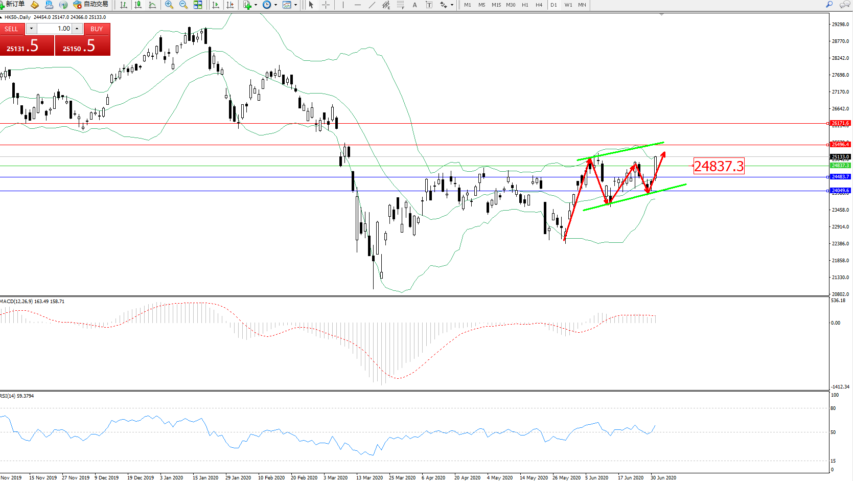 香港恒生指数72日(周四)收盘上涨697.0点,涨幅2.85%,报25124.19点;港股三大指数呈高开高走行情,尾盘恒指涨幅扩大至近3%,红筹指数更是暴涨6.36%3995点。南下资金大幅流入66.09亿港元,大市成交额放大至1759.9亿港元。中资券商股、内房股全线爆发力促大市走高,中芯国际大涨超17%再创新高,市值逼近1800亿港元。蓝筹权重股集体上扬,腾讯、港交所续创新高,分别大涨4%6%。 恒指6月的止跌给7月的行情带来了积极信号,对于7月行情,市场可以积极看好。香港本土事件方面,石头落地,警报解除。再来看国际关系,临近美国总统大选,连拜登都拿来说事,但要清楚一点,就是为了选举的需要,打嘴炮和实际操作是两回事。所以也没必要入戏太深。