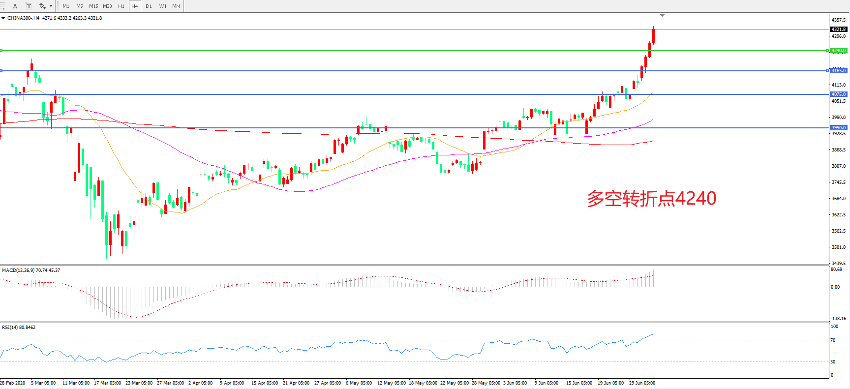 4小时图看,沪深300长阳连续拉升,多头趋势明显,均线系统呈多头排列, MACD红柱增加,RSI指标向上,日内延续上行概率较大。