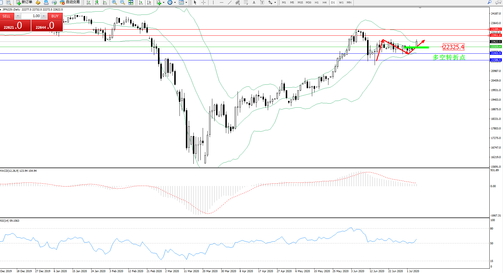 日经225指数7月6日(周一)收盘上涨403.11点,涨幅1.81%,报22695.50点。全球风险情绪在美国长假过后仍偏向转暖,亚洲股市不断走高,尤其是中国股市近期不断飙升,疫情对经济的影响可能有限。风险资产后市或继续走强。本月迄今的市场操作表明,日本央行无意扩大债券购买规模。尽管供应大幅增加,但是两年期和10年期债券竞拍结果颇为稳定,或表明收益率能够得到控制。日本央行上周1-3年期债券购买量为4200亿日元,而购买量指导区间中点是4250亿日元;日本央行10-25年期债券购买量也保持稳定,3-5年期债券购买量是3500亿日元。