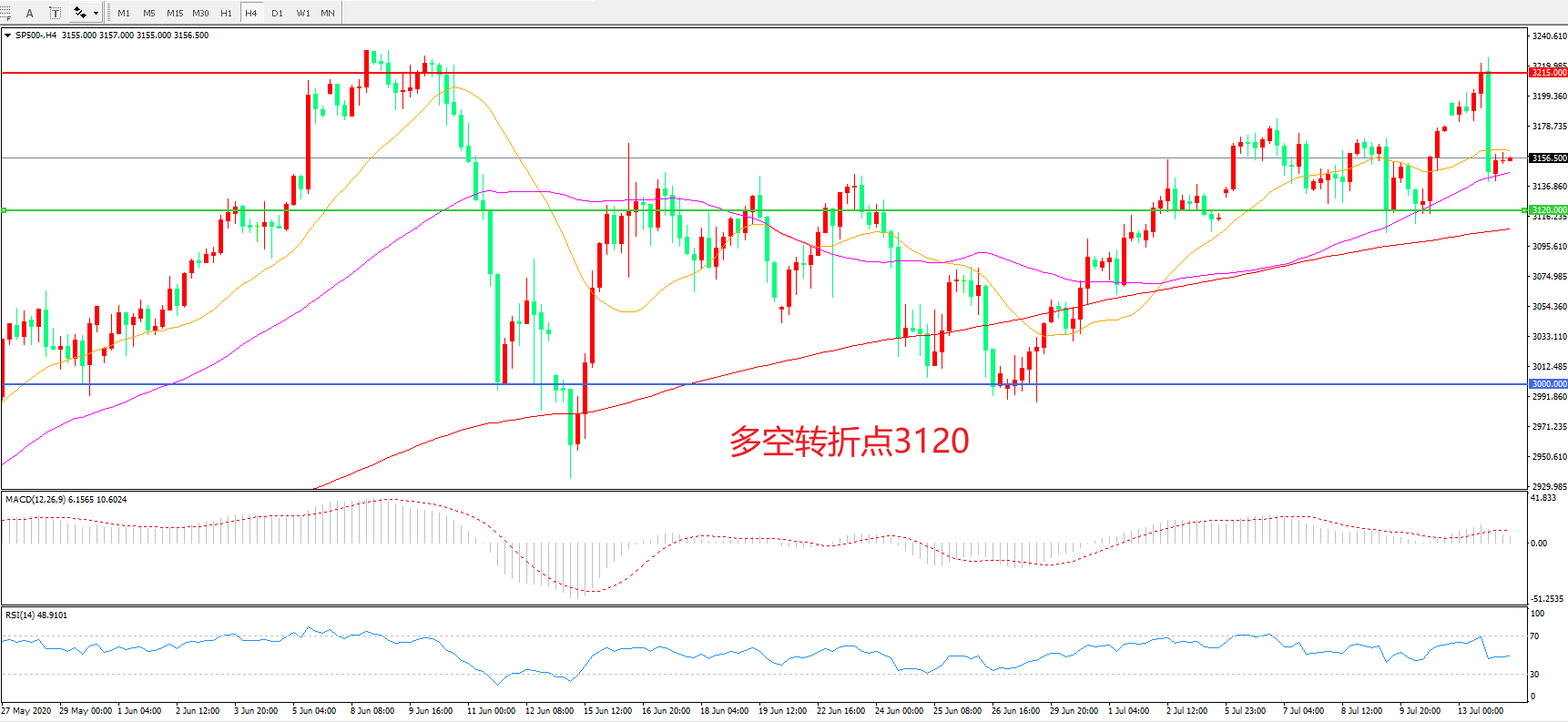 4小时图看,标普500长阴下挫,短期走势趋弱,55周期均线成为短期支撑, MACD红柱减少,RSI指标走平,日内延续震荡概率较大。
