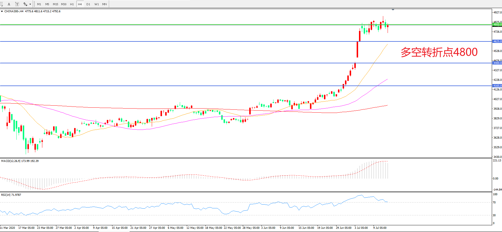 4小时图看,沪深300延续高位震荡,4800成为短期震荡中枢,整体来看,依然处于多头趋势之中,均线系统逐渐发散, MACD红柱增加,RSI指标向上,日内延续上行概率较大。