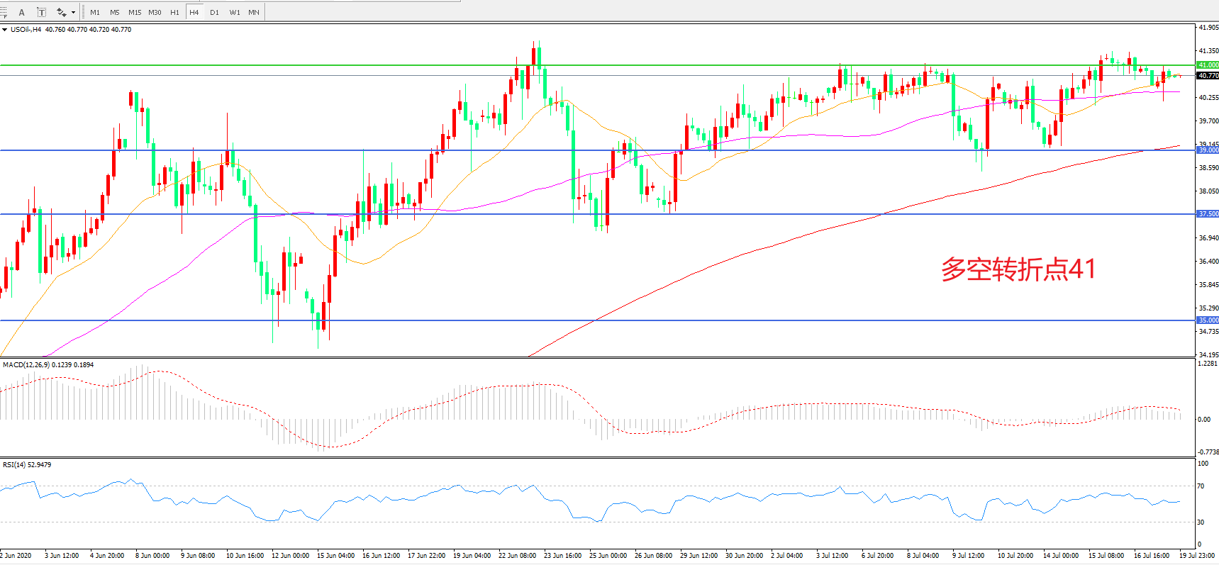 4小时图看,油价延续高位震荡,41美元成为短期争夺焦点,均线系统走平,MACD红柱增加,RSI指标走平,日内延续上行概率较大。