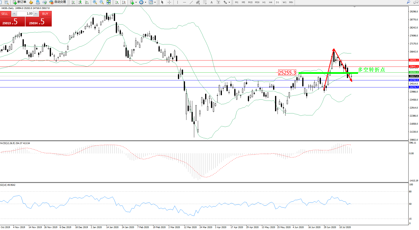 技术点评:多头动力延续布林带指标上轨强势拉升上扬后,遇阻呈倒V型邹走势回撤至布林带指标中轨附近弱势整理下行至中轨下侧徘徊,布林带指标呈收口走势持续中,该位正是前期关键多空分水岭位置节点,短期或将维持整理数日,MACD指标处于多头区域高位弱势整理回撤走势中,RSI指标处于多头区域弱势整理回撤至50均衡线附近持续徘徊中;