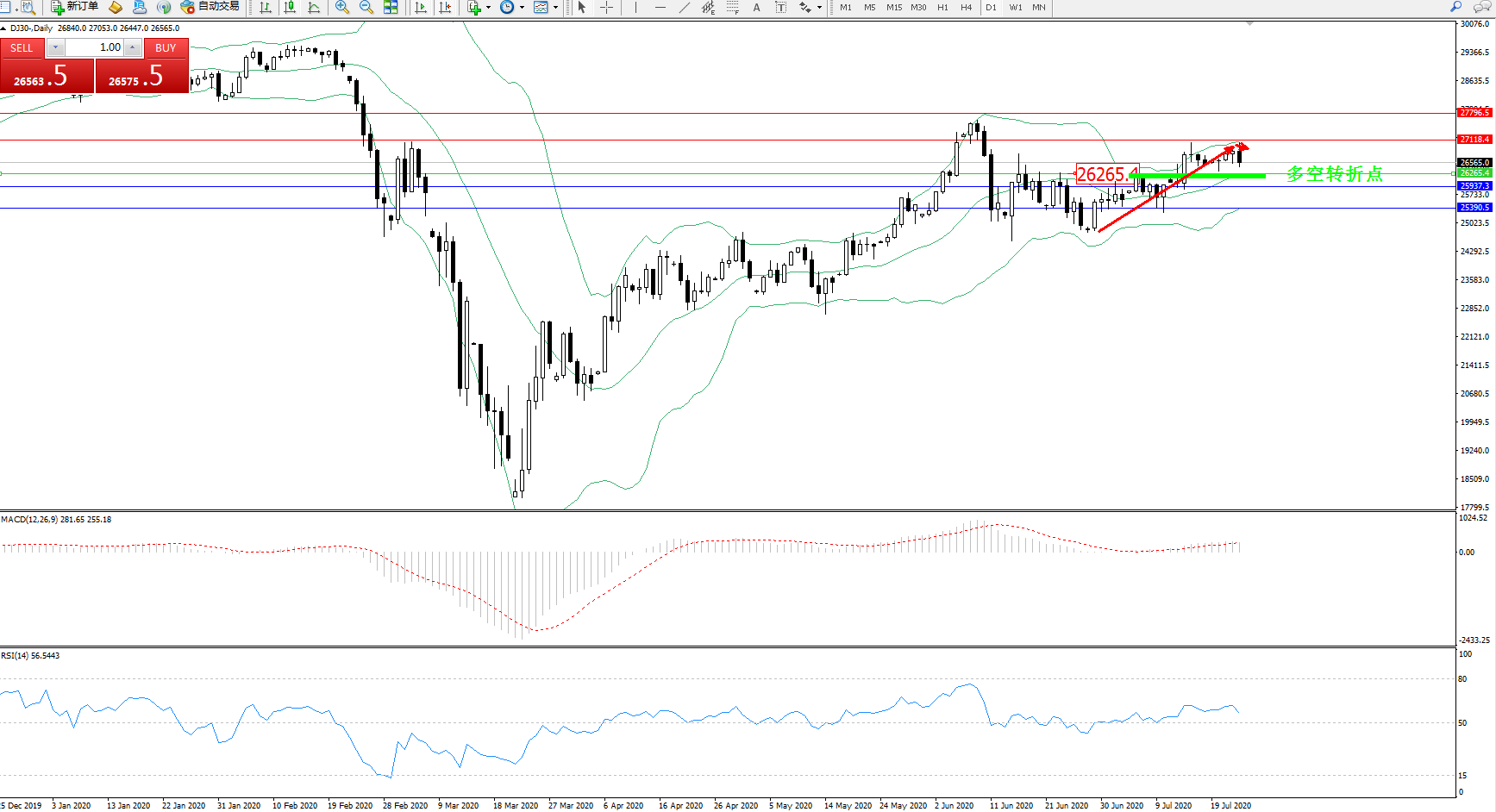 技术点评:长时间纠结于布林带指标通道内持续窄幅震荡走势中,多次试探上轨附近节点后,终究多头动力破位上扬,但后续动力略显不足,突破布林带指标上轨附近关键节点后有回撤迹象,关注26265附近转折点,布林带指标呈收口走势后有张口态势,MACD指标长时间纠结于0轴线上方弱势徘徊平移中,RSI指标处于50均衡线上方维持窄幅整理有开始有回撤下移走势;