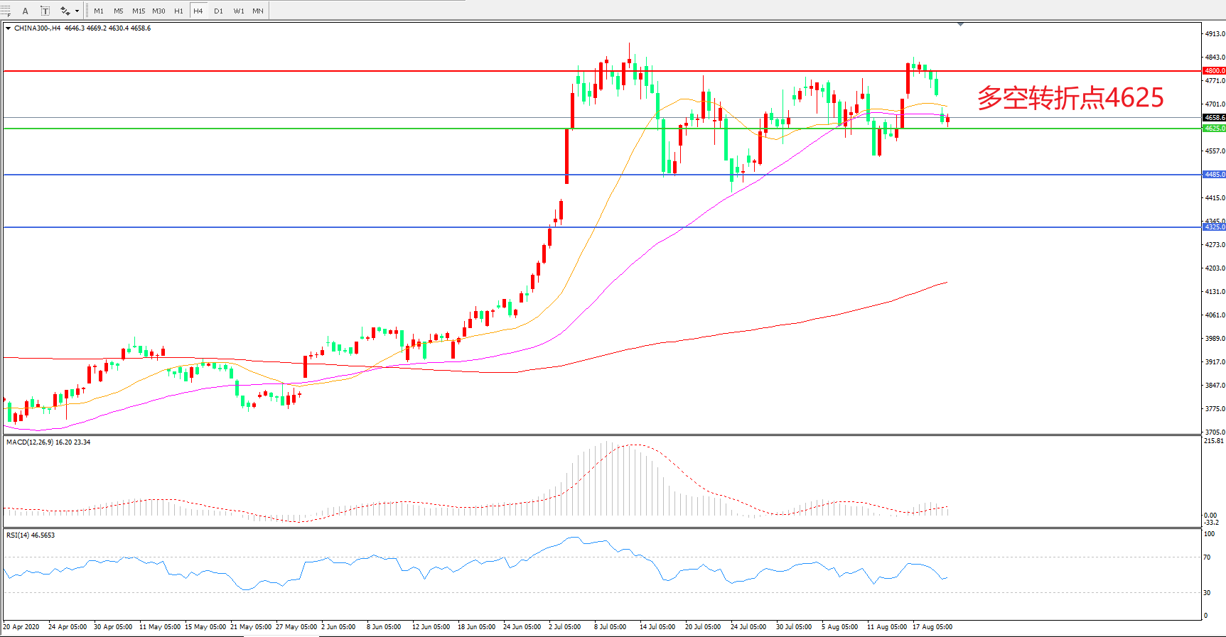 4小时图看,沪深300跳空低开,延续低位震荡,整体走势低迷,4628成为短期支撑,均线系统走平, MACD红柱缩短,RSI指标向上,日内延续震荡概率较大。