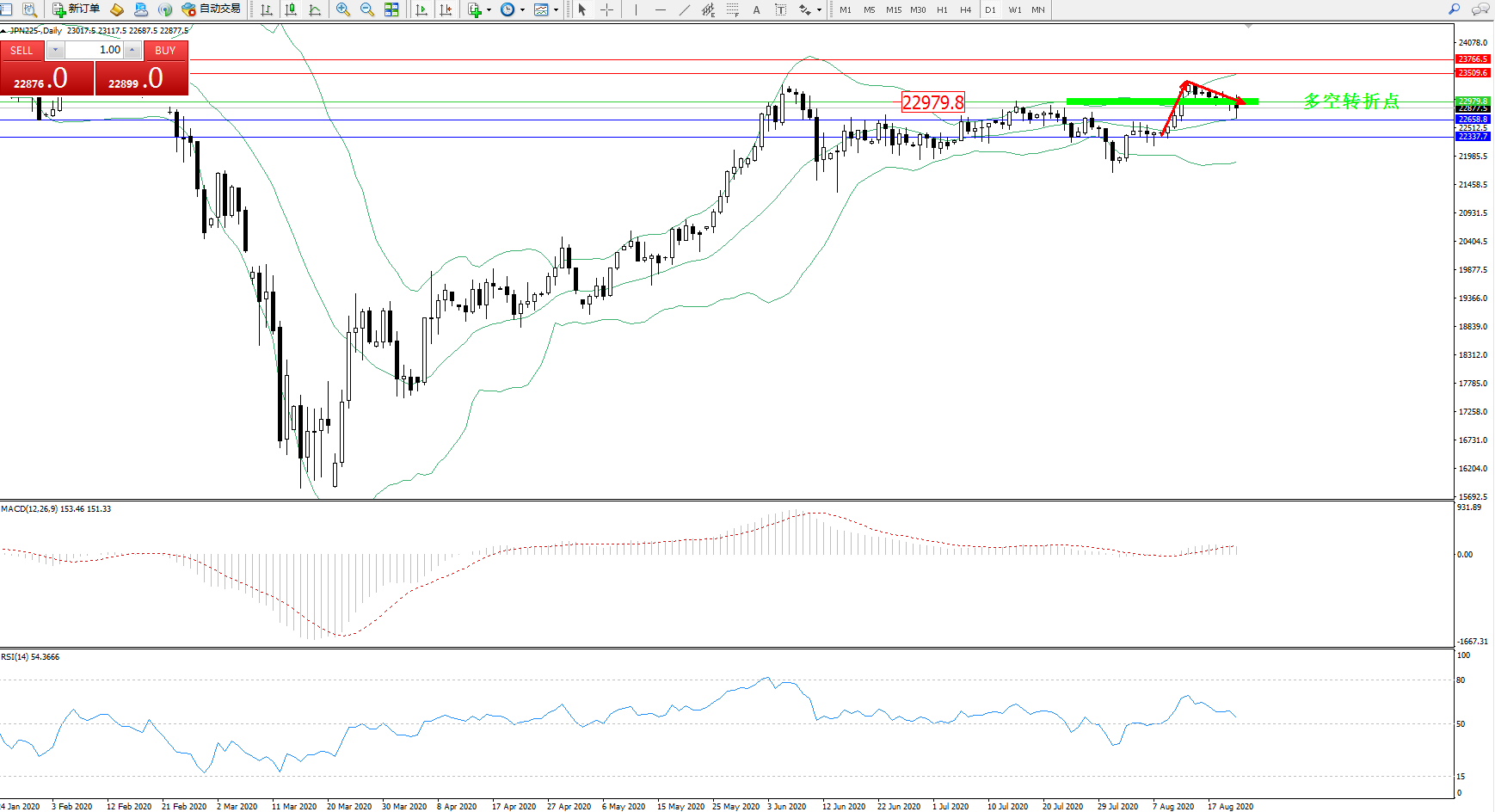 日经225指数8月21日(周五)收盘上涨77.88点,涨幅0.34%,报22958.50点。投资者仍对美国选情进一步发酵带来的不确定性持有担忧情绪,这恰好与全球避险情况和日本方面的利多消息一同,日本央行提供4200亿日元的1-3年期国债购买;日本央行提供4200亿日元的5-10年期国债购买;日本央行提供3000亿日元的25年期国债购买;日内日本将在此后有限度地放开境外游客入境限制,目的旨在尽早复苏该国深受打击的旅游业,此消息对于日本经济的未来潜在需求也是一大拉动。与此同时,投资者却仍对全球疫情和贸易走向持有顾虑情绪,这使得日元避险买需同样维持在高位;在周末来临之际,全球经济政治和公共卫生状况的不确定性仍会带来额外的避险需求。