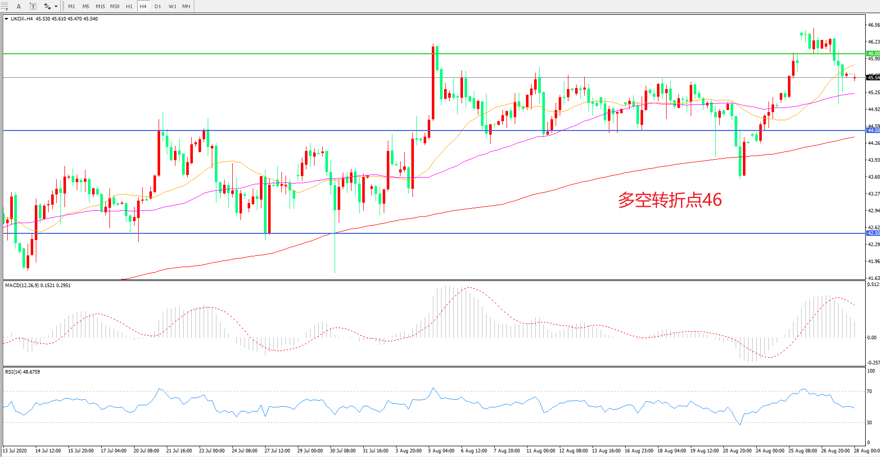 4小时图看,油价触及46.5一线后大幅回落,整体走势再度陷入分歧,均线系统仍呈多头排列,MACD红柱减少,RSI指标走平,日内延续震荡概率较大。