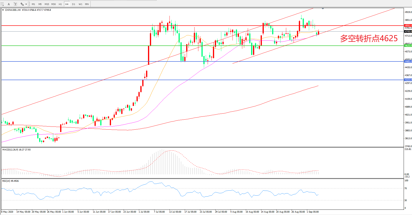 上周五(9月4日),受隔夜美股下跌以及市场空头介入的影响,A 股受到短期冲击,风险偏好持续抑制下,市场整体震荡加剧,沪深300低开后小幅上行,收报4749.8点。从振幅上看,当前指数的波动较前期已有所收窄,在反复消化上方阻力之后,中期向好趋势并未改变。