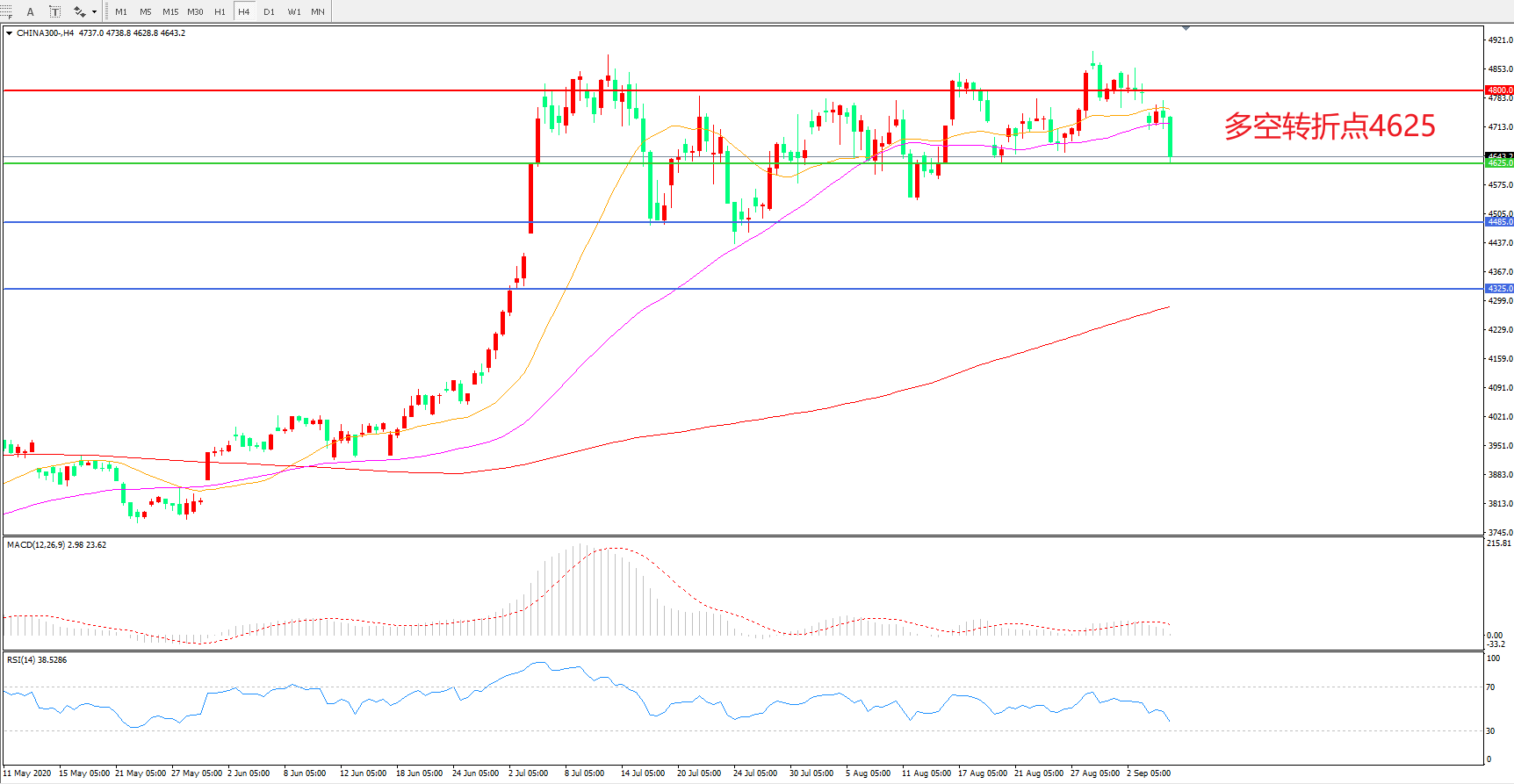 4小时图看,沪深300长阴下破,短期走势不佳,均线系统走平, MACD红柱缩短,RSI指标向下,日内延续震荡概率较大。