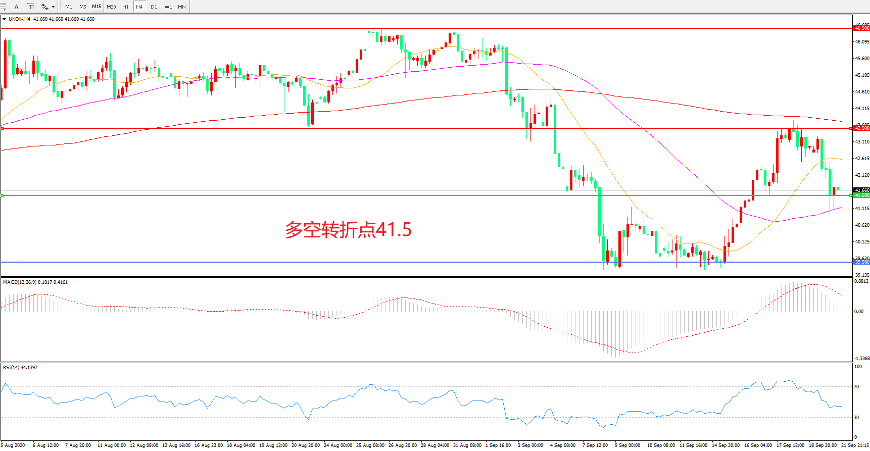 4小时图看,油价长阴下破,短期涨势遭到破坏,但41.5支撑依然强劲,均线系统走平,MACD红柱减少,RSI指标走平,日内延续震荡概率较大。