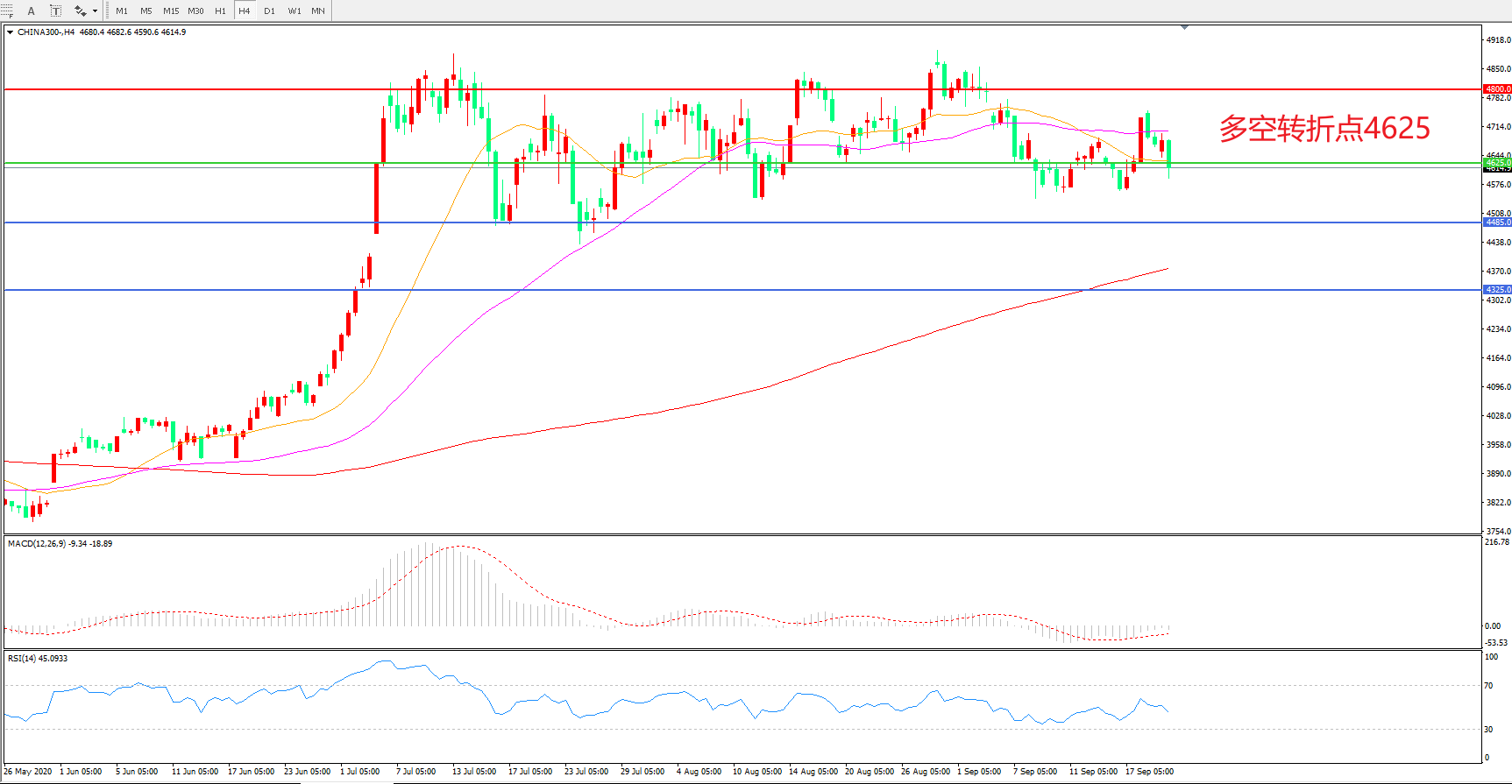4小时图看,沪深300冲高回落,短期涨势受阻,4625成为多空争夺焦点,均线系统走平, MACD绿柱缩短,RSI指标向下,日内延续震荡概率较大。