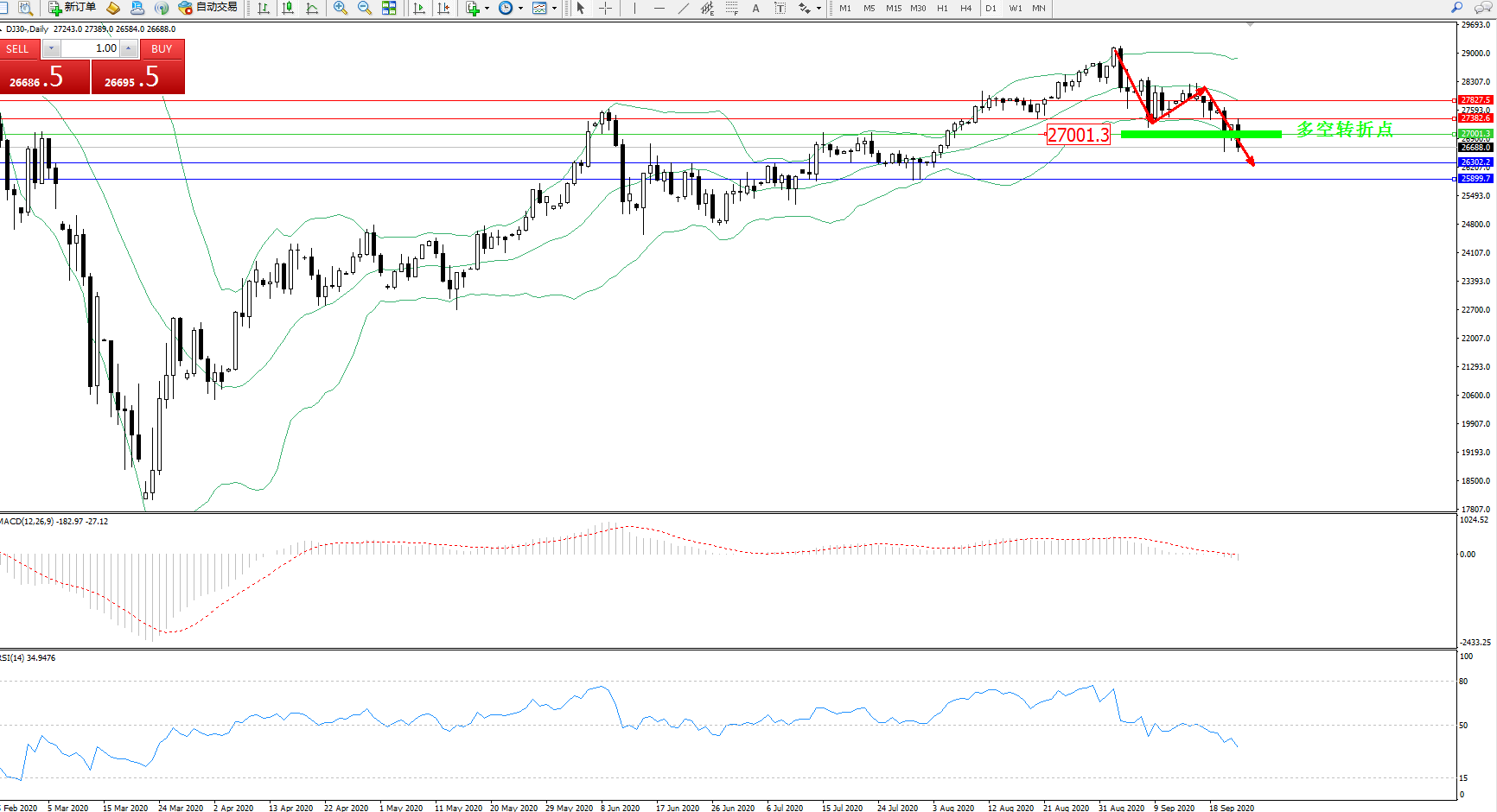 道琼斯指数9月23日(周三)收盘下跌525.00点,跌幅1.92%,报26763.13点。隔夜美联储主席鲍威尔称经济活动已经从萧条的第二季度水平回升,美国经济正在改善,但要从新冠病毒大流行中全面复苏,还有很长的路要走。市场感到相当意外,在美国平均通胀达到2%后,美联储可能会加息。鲍威尔本周将在国会进行为期三天的证词陈述,密切关注是否继续释放相关货币政策信号。多重利好助推美元攀升。隔夜美国房地产数据表现靓丽,之前偏向鸽派的美联储官员埃文斯意外发表了鹰派言论,美国美国众议院两党通过临时支出法案以避免政府关门给美元提供支撑。过去几个月,从美联储那里听到的都是,在可预见未来的任何时候都不会加息。然后埃文斯挑战了这种说法,所以市场措手不及。埃文斯通常被视为较为鸽派的美联储官员之一。