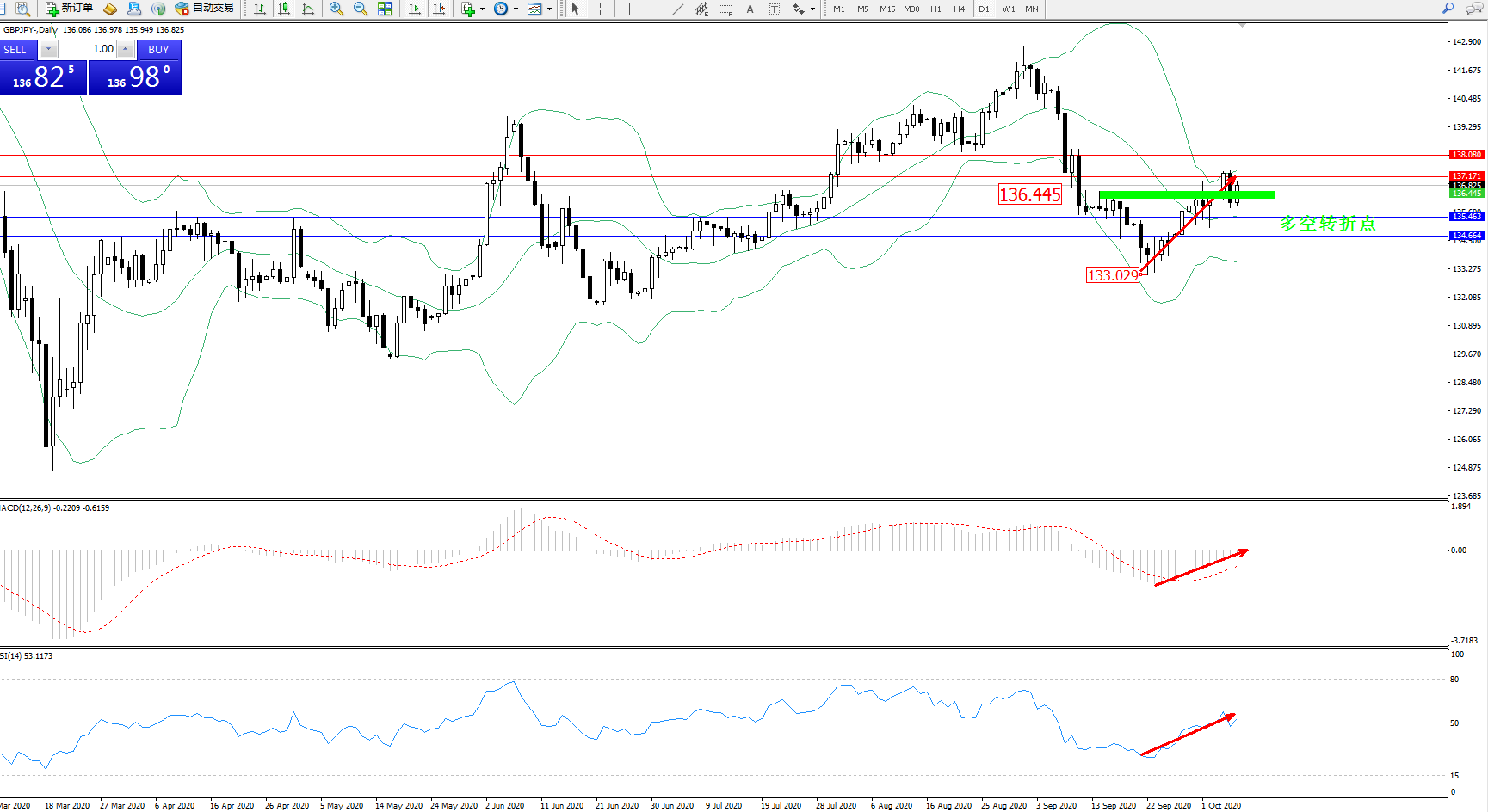 英镑兑日圆纠结于136.825附近整理,英国首相与欧盟委员会主席对最近的谈判做出了相对乐观的评估,会后声明鼓励谈判代表在10月15日领导人峰会前填补分歧。英国约翰逊谈试图掩盖自己仍面临下议院议员反叛以及英国脱欧贸易谈判继续陷入僵局的事实。在近期会议中,市场对英欧双方或将达成贸易协议的预期不断加大,也就是说,在现阶段谈判的贸易协议几乎肯定会缺乏脱欧初期所涉及的全面性,随着2021年临近,英国某些行业可能会发现成为英国脱欧进程中的牺牲品,而其他行业则将继续在新冠疫情封锁措施下维持运作。由于约翰逊目前在党内的威信不足,上述经济背景对其不利。英国面临经济和政治方面的阻力,这暗示即使10月底英欧签署脱欧贸易协议。