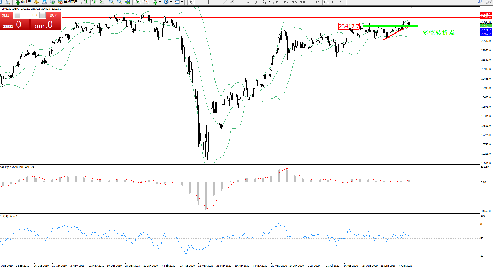 日经225指数10月14日(周三)收盘上涨23.72点,涨幅0.10%,报23625.50点。为遏制新冠病毒而寻找医学突破的冲刺在本周遇到坎坷,两家致力于研发疗法和疫苗的制药巨头均在临床试验阶段遭遇挫折。出于安全考虑,暂停了政府资助的抗体疗法临床试验。就在这一消息公布不到24小时之前,强生表示,由于一名参与试验的志愿者生病,其试验性疫苗研究暂停。市场避险情绪再度发酵;投资者对全球疫情在短期内得到控制的前景进一步感到悲观,在美国选情与财政问题的不确定性也依旧存续的大背景下,全球股市或将集体回落。在寻求预防和治疗新冠感染相关产品方面的推进可能过快了。在11月3日总统大选来临之前,监管机构和制药商已然面对着政治压力是否盖过科学严谨性的质疑。上周,美国总统特朗普大肆宣传抗体疗法是一种治愈方法,而且他领导的政府也在竭力争取快速批准治疗方案和疫苗。