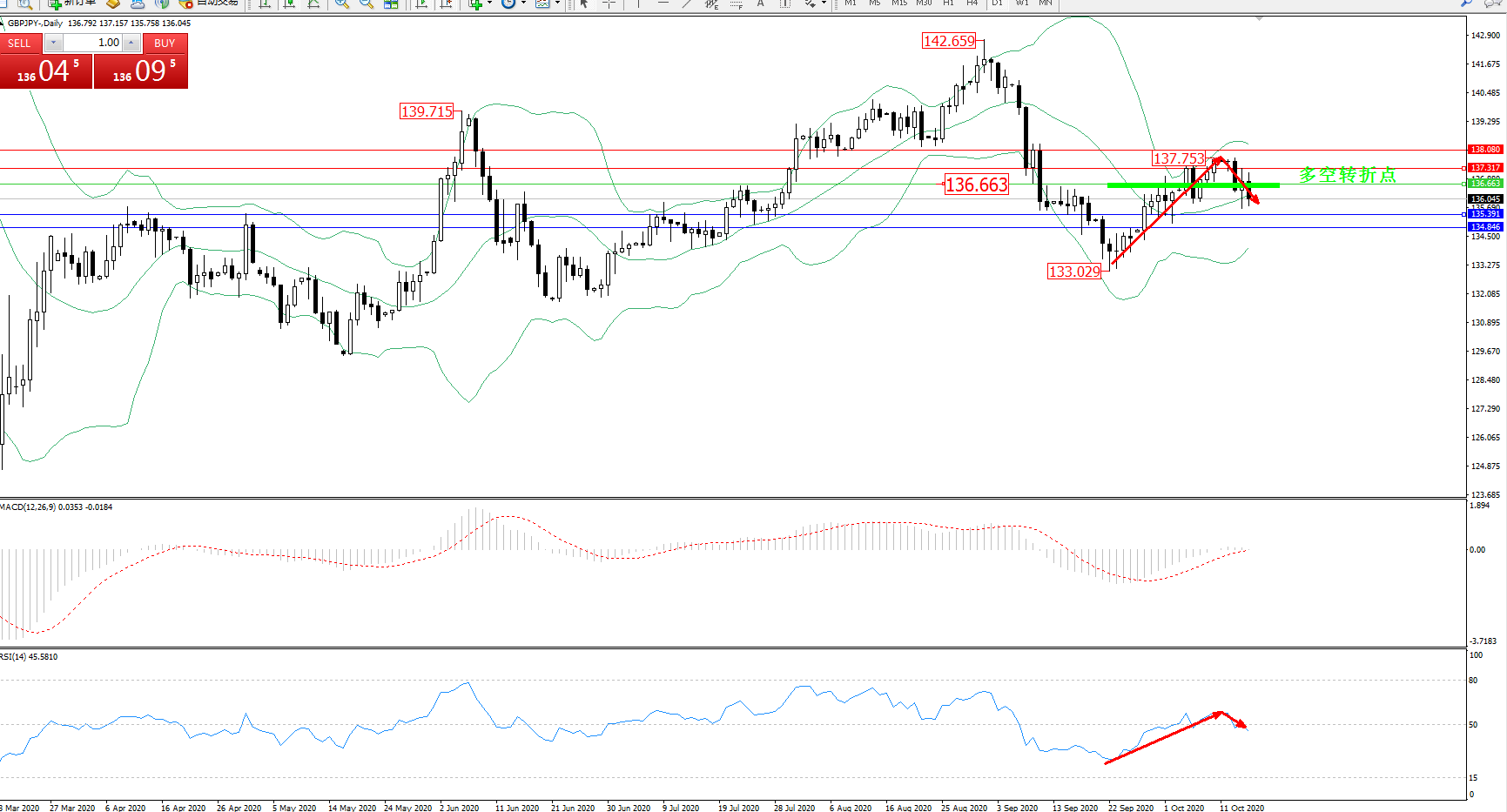 技术点评:低位多头动力持续震荡上扬至137.753位置附近后遇阻,开始震荡回撤,处于中上轨区间高位下行,纠结于中轨附近持续徘徊中,有继续向下移动态势,布林带指标呈收口走势中,MACD指标处于空头区域低位整理回升至0轴线附近弱势徘徊中,RSI指标低位多头动力整理回升至50均衡线后持续震荡后有回撤下行迹象;