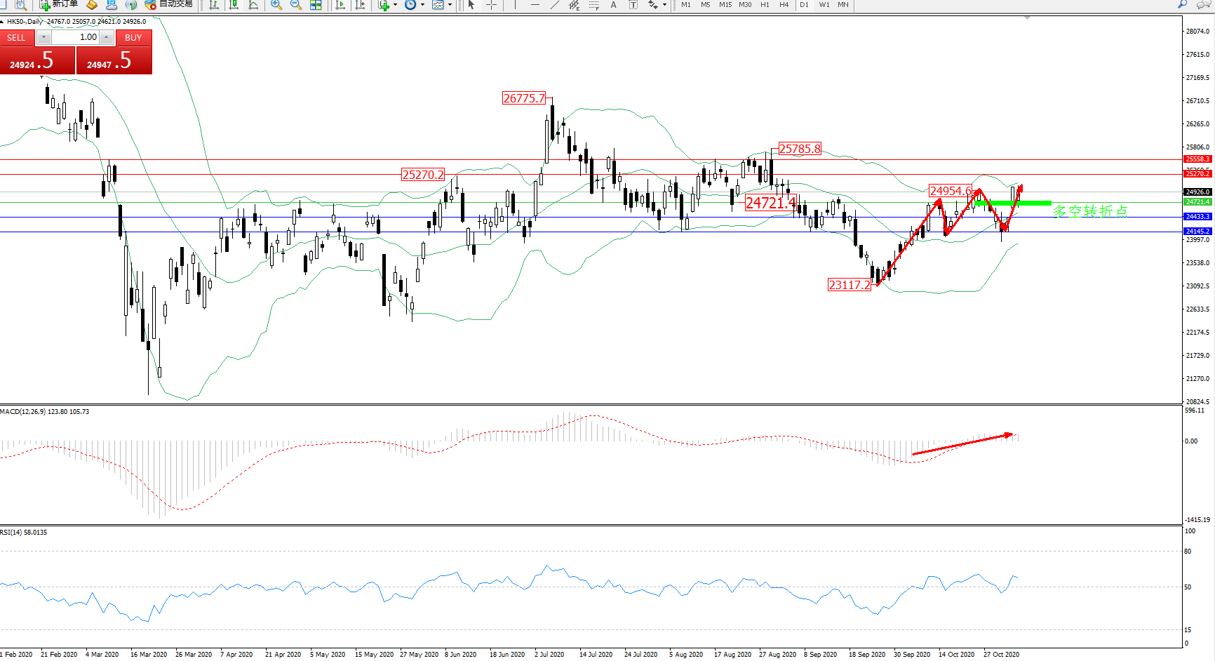 香港恒生指数11月4日(周三)收盘下跌53.59点,跌幅0.21%,报24886.14点;受美国大选消息影响,港股主要指数波动明显,恒指盘中几度转涨,尾盘再度转跌,恒生科技指数涨0.57%。恒生科技股分化严重,蚂蚁集团暂缓上市,阿里巴巴跌7.5%,蚂蚁金服概念股亦普跌;腾讯收跌1.59%;双11受益股小米涨7.88%、联想集团升8.3%,美团升6%再创新高,京东盘中亦破顶。今日南下资金净流入82.82亿港元,大市成交额为1728亿港元。隔夜美股阿里巴巴大跌8.14%报285.55美元,折算成港股市场价格为276.69港元/股。昨晚上交所和港交所分别发布暂缓蚂蚁集团上市的公告。据悉,蚂蚁集团执行董事长井贤栋当晚召集集团内部中高管召开紧急会议,在会上透露保守估计蚂蚁重新上市的时间要被推迟半年左右,此次蚂蚁IPO打新的资金会退还给投资人。蚂蚁集团今早发公告称香港公开发售的申请股款将不计利息分两批退回。