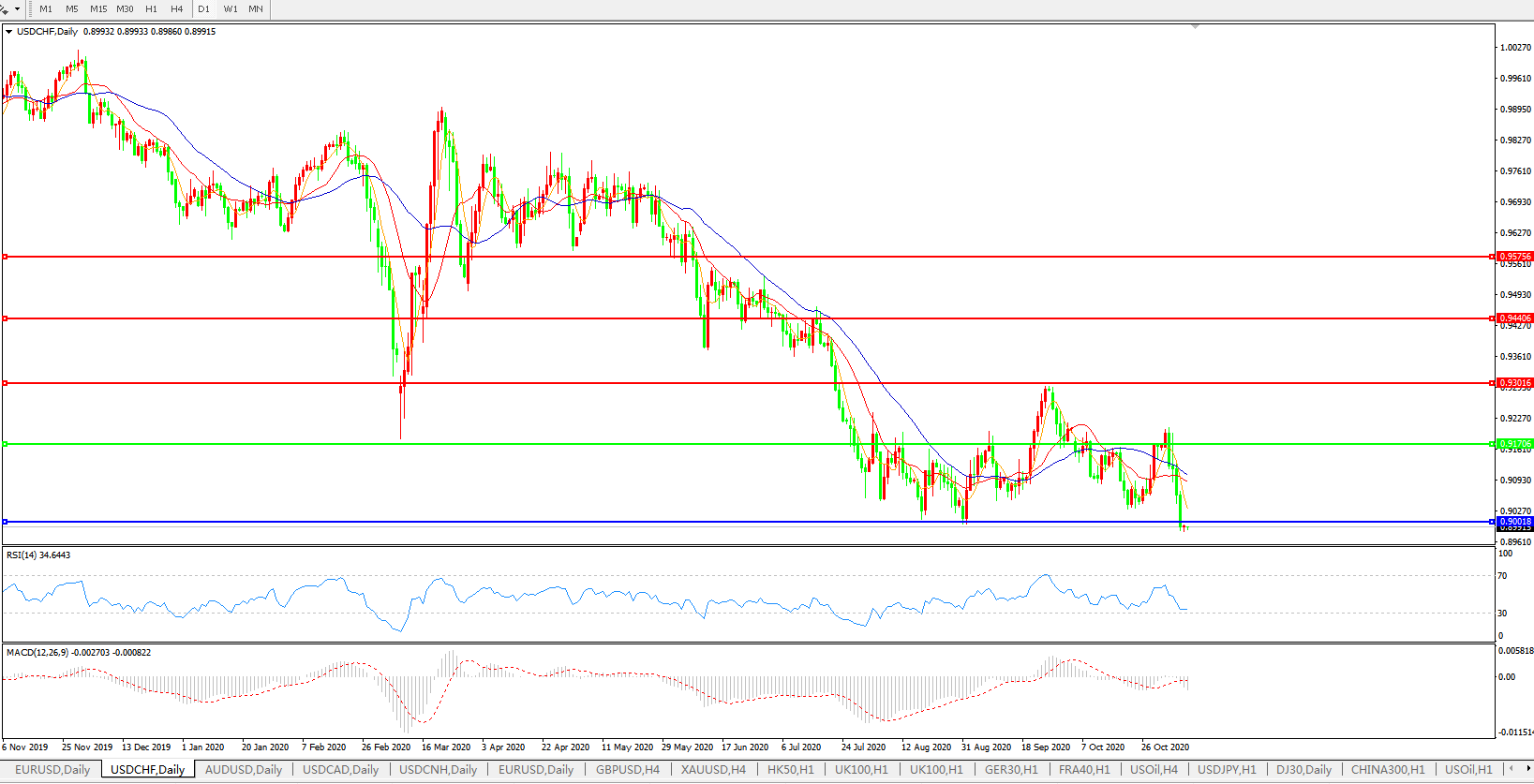 周五(11月6日)纽约时段美元兑瑞郎加速下滑,跌至接近六年新低,最低触及0.8998的低位。美元兑瑞郎走低,主要受累于避险情绪的升温,由于美国大选政治不确定性,美元遭到抛售,而非美元品种普遍攀升,其中有避险属性的瑞郎更是受到明显的支撑;尽管民主党候选人拜登接近赢得大选,但这场实力伯仲的大选还在继续中,特朗普已经开始在摇摆州开始诉讼和重计票。有分析指出,大选可能会造成美国民意的分裂,甚至有分析认为大选之后可能会发生暴力事件,这增加了市场的不确定性,投资者寻求包括瑞郎在内的避险品种避险;美联储在周四的利率决议中,继续保持相对鸽派的姿态,承诺采用一切可能的措施来支撑经济,美联储鸽派的姿态继续给美元施压从而支撑了瑞郎;稍后,投资者需要密切关注美国即将公布的10月份非农就业报告,目前市场对本次就业报告预期相对悲观,10月份美国的二次新冠疫情越发严重,很多地区重新开始封锁,劳动者又再度失去工作,如果本次数据不及预期,那么美元可能又会遭到新一轮抛售