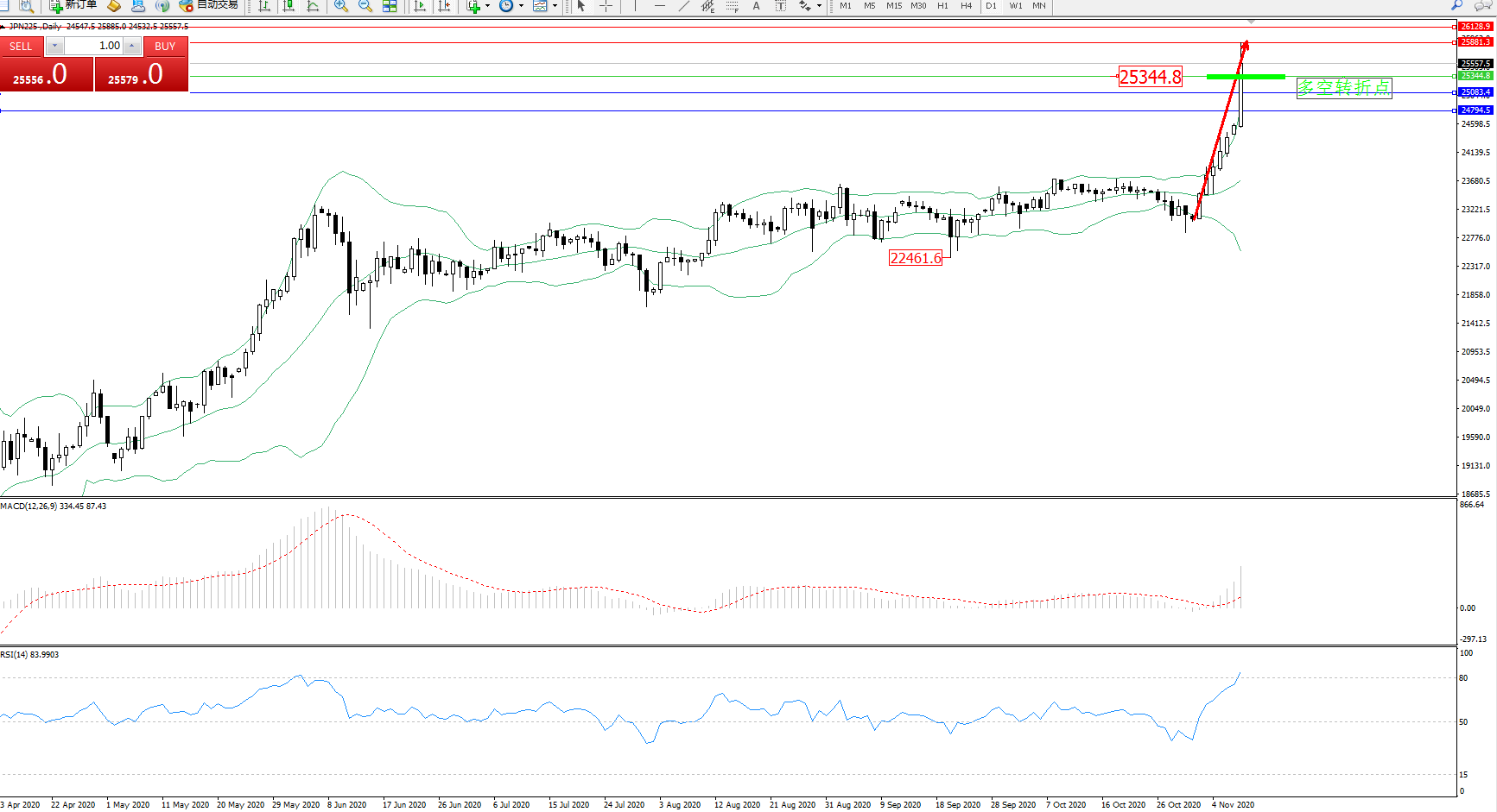 日经225指数11月9日(周一)收盘上涨550.77点,涨幅2.26%,报24876.00点。市场继续交易拜登胜选,投资者逐步押注美元走低及各大类资产走高,全球股市纷纷大涨,市场押注拜登胜选后将执行更大规模的经济刺激行动,且有助于维系全球经济关系,改善全球贸易摩擦,这个结果已大体被市场消化。上周末段,市场一直是以拜登当选总统、以及共和党掌控参议院的看法在进行交投。可能意味着拜登的抱负将受到政治僵局的压抑,重大的立法改变或难以在国会通过。尽管如此,这也意味着监管改革的可能性下降,尤其对科技股有利,而税收调整可能性下降可能对股市有利。日本内阁官房长官加藤胜信:日本希望和美国密切沟通,发挥两国的领导作用,实现自由、开放的印太地区。将与美方积极合作,应对气候变化问题,希望与国际奥委会密切合作,东京准备举办奥运会,确保运动员和观众的安全,有迹象显示日本新冠疫情卷土重来,要高度警惕,密切监测新冠疫情。